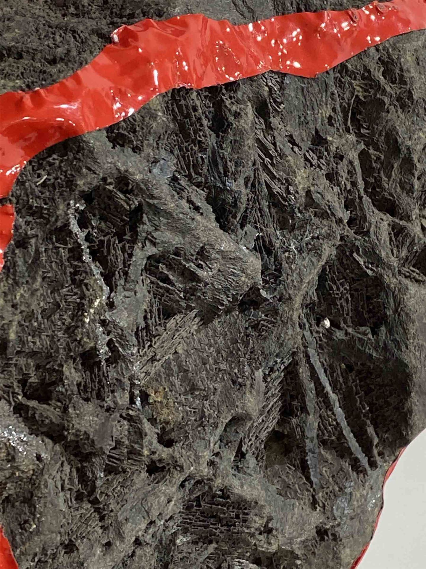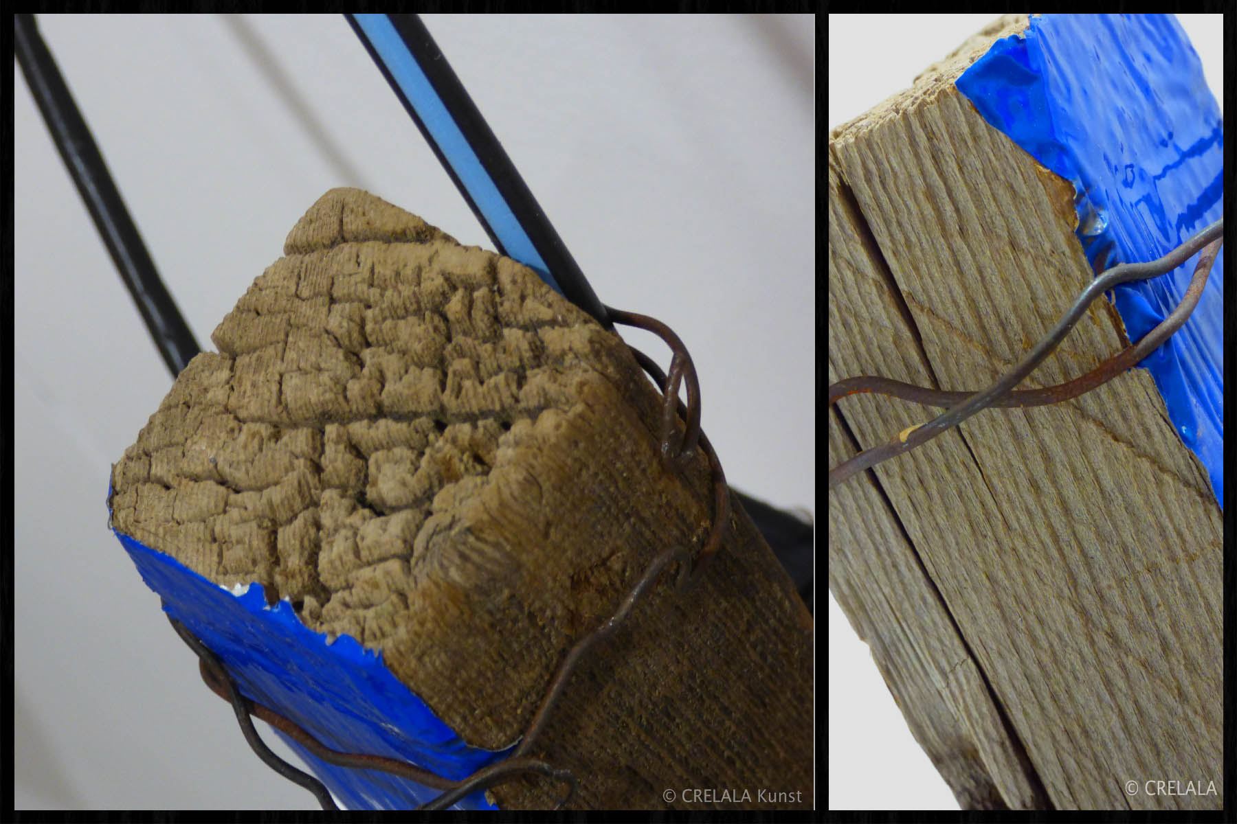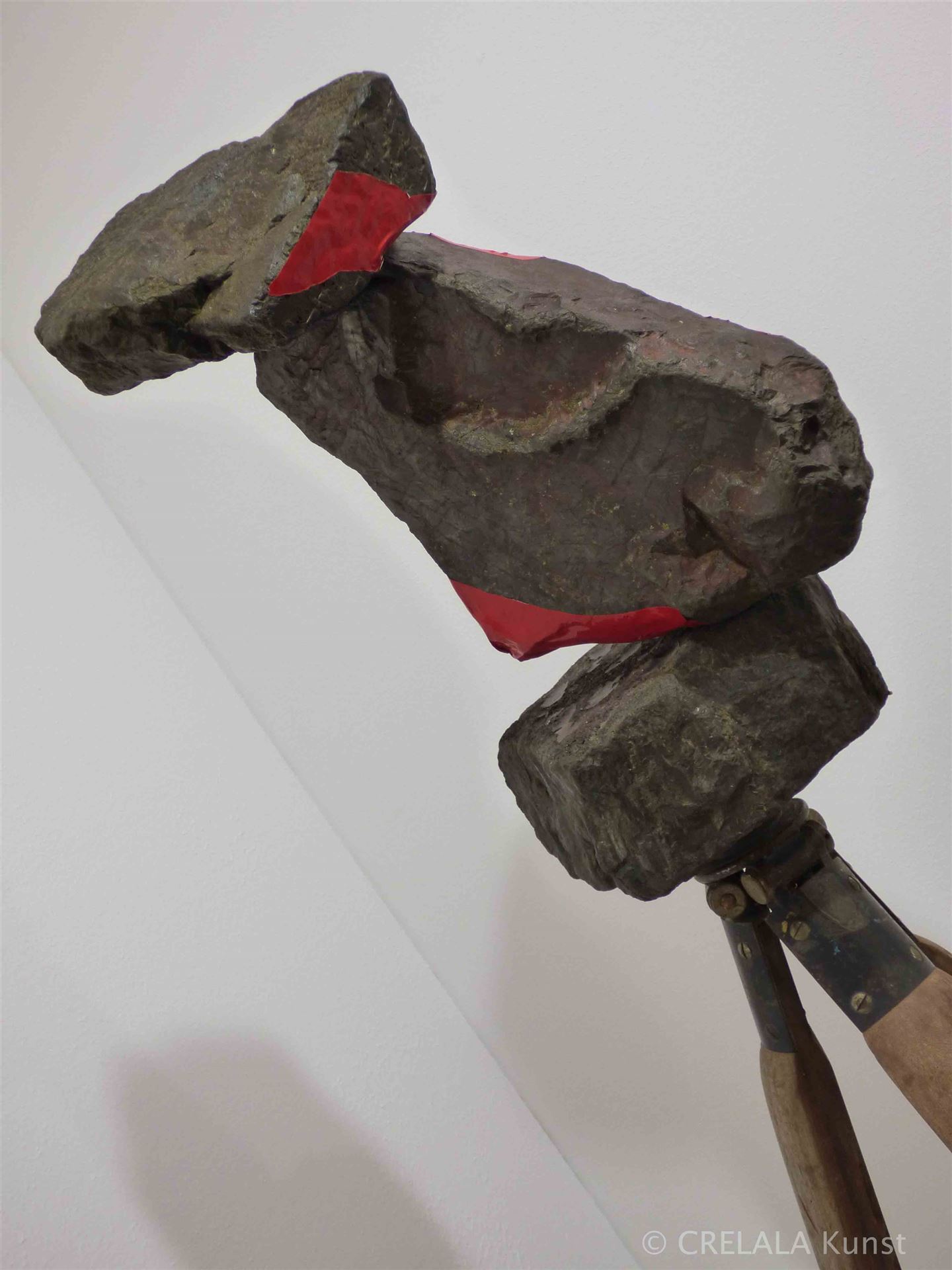Auf einem hölzernen Stativ, wie ein altes Dreibein, wie ein Ruhepol für optisches Arbeiten in Fotografie, Film, oder Vermessung, thronen drei schwarze Steine! Besondere Steine mit besonderer Textur. Besonderer Struktur. Am Boden ein weiterer Stein, rot umrandet, ge“framed“ und warum auch immer denkt man an Tunguska.