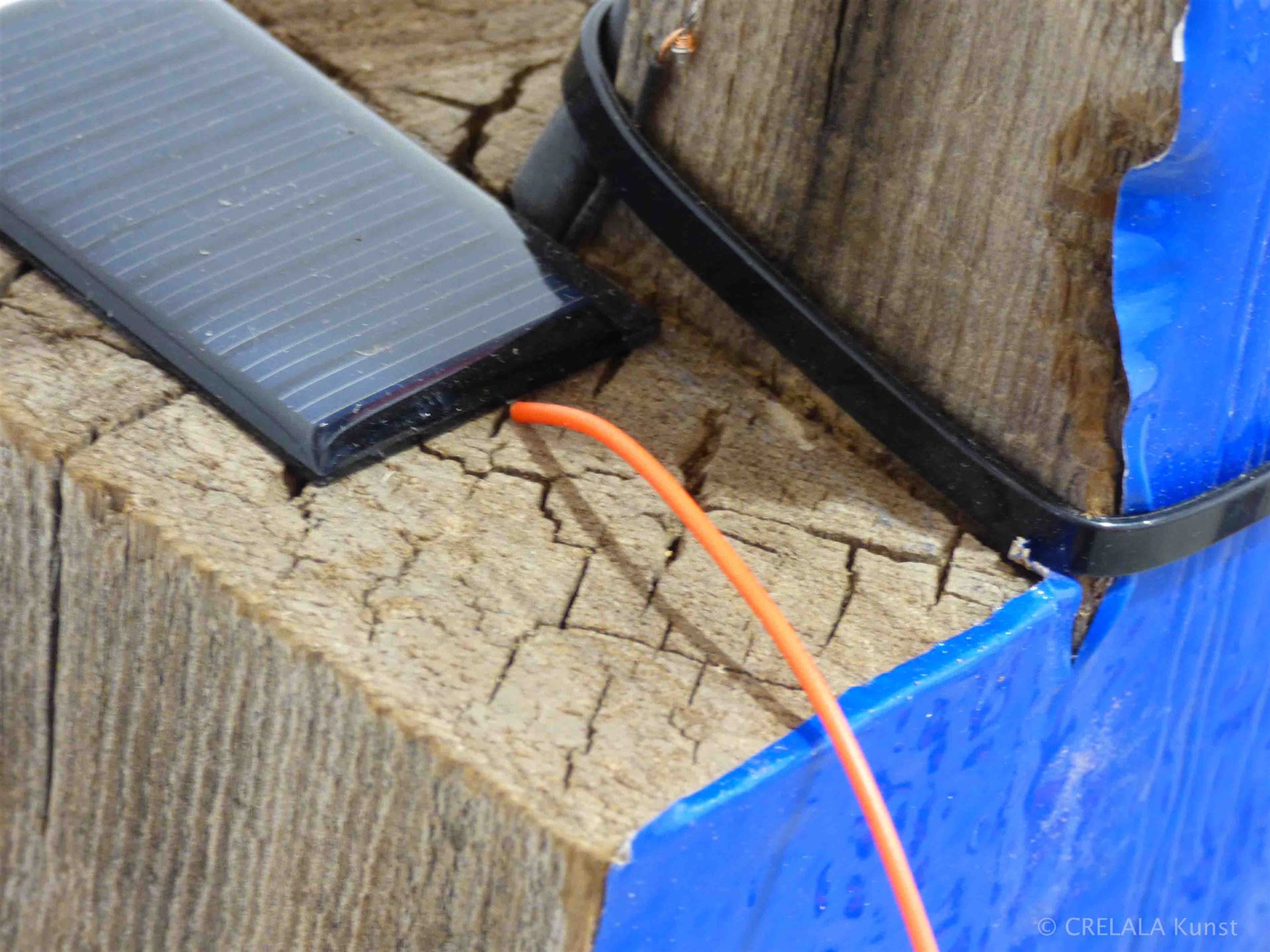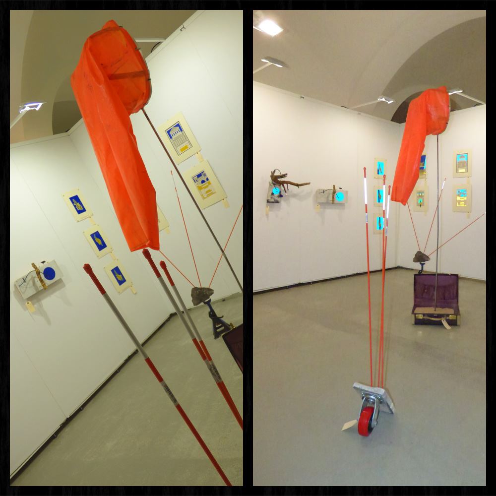 In dem Arrangement findet sich ein Stein aus Lehm in einem Koffer, in dem eine Stange steckt mit einem Windbeutel / Windsack. „Bordering Wind“. Welche Bedeutung hat die Arbeit? Andersons Kunst lässt so viele Fragen offen, dass man sich vielleicht vornimmt seiner Arbeit zu folgen. Die Box wirkt wie eine Zusammenstellung von Fragen nach der Essenz des Seins. Nach Überlegungen, wie Nachhaltigkeit funktionieren kann. Und welche Rolle spielt bei all dem die Sonne? – Das Licht? – „Solares“ – Unser Lebenselexier!