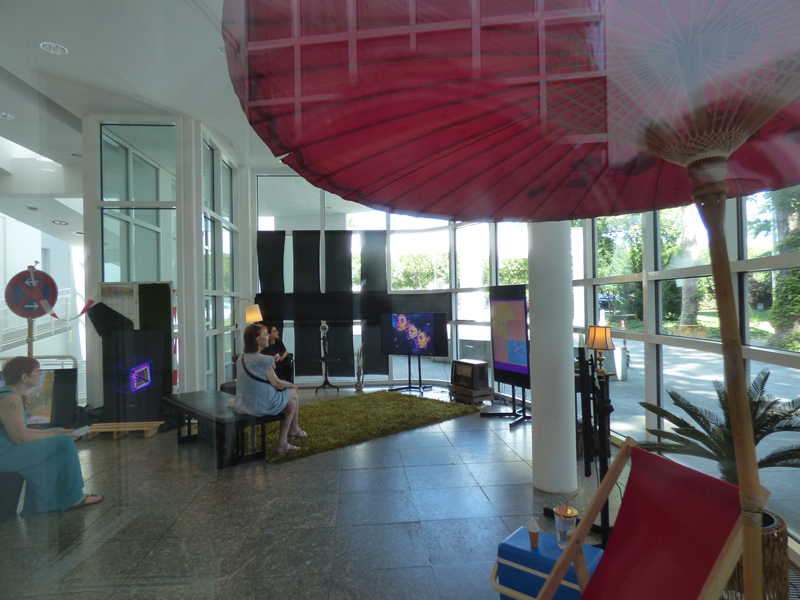 Die digitalen Zahlungsformen, unter anderem Paypal, werden angesprochen und es fallen die Begriffe Etherium und Bitcoin. Etwas freier betrachtet wird über virtuelles Finanzwesen gesprochen. Die Blockchain ist die Absicherung, dass nichts löschbar ist. Was auch immer seinen Weg ins Netz findet ist dort für die Ewigkeit gespeichert. Dezentral verteilt. „Spreaded!“ Zellgeteilte Augmented Reality. Und alles ist Kunst. Die vertonten Kunstwerke sind kleine Filme, wie erste Trickfilme, Kunst, aufgelöst in ihre Einzelteile, in einzelne Blöcke. Kuben und Töne. Einfachste Animationen oder Kinderfilme mit lustigen Tönen, bis zu ausgefeilten Videokunstwerken werden präsentiert. Kunst, die vielleicht mehr kann, als nur den Blick fesseln.
