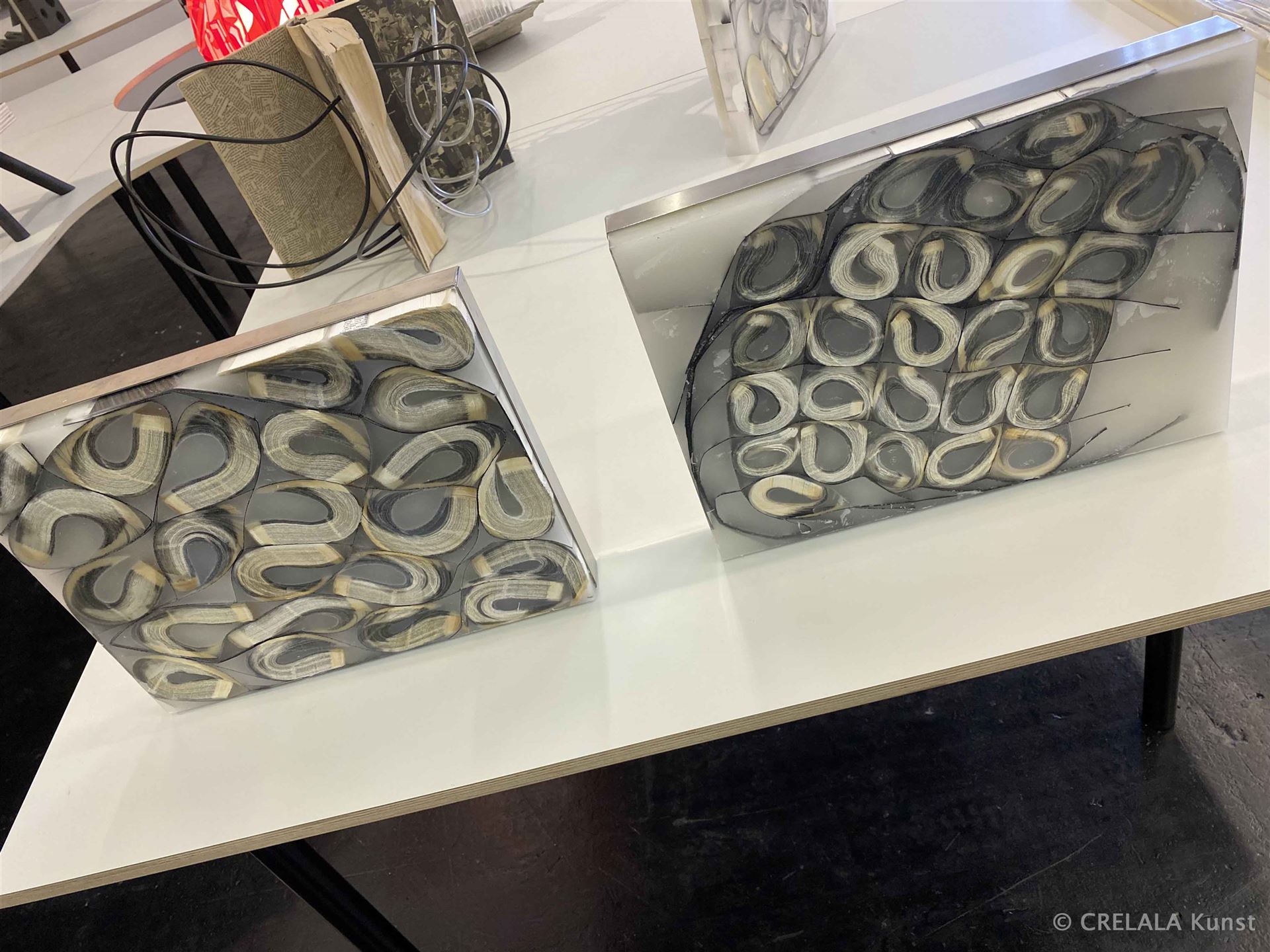 Wüsste man, dass man Gutes bewirken kann, indem man der Nachwelt überlässt, was schon aus der Vergangenheit gelernt ist, was würde man tun? Würde man Bücher schreiben? Sie digitalisieren und ins Universum entsenden? Würde man Informationen nach DRAUßEN schicken? Zum Beispiel Fragmente des menschlichen Organismus, gegossen in Klötzchen? Bücher, die aussehen wie Knochen? Wie Wirbelsäulen, die einen Körper stabilisieren? (In einer Arbeit von Reese-Heim ohne die Dämpfer zwischen den Knochen. Ohne Bandscheiben. Ohne Puffer.) Wie Zellverbände. Wie ein Haufen Knochen ohne Kern. Ohne Knochenmark.