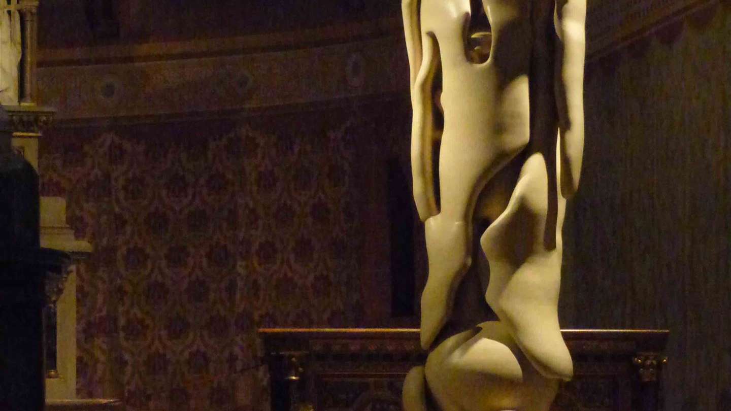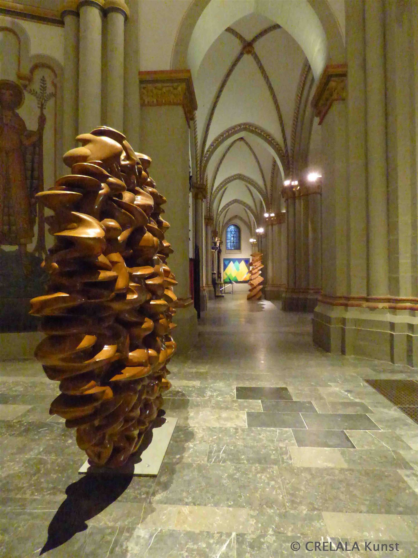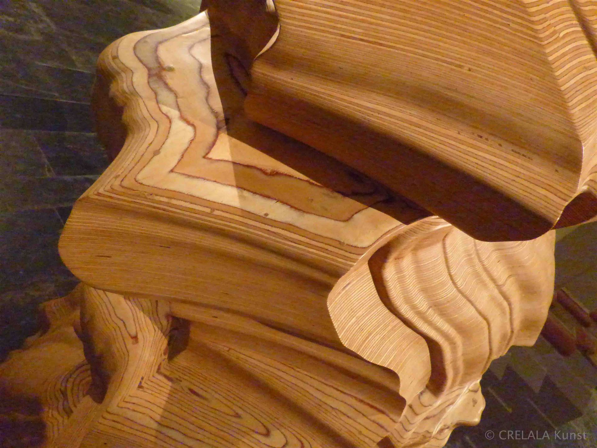 „Against the grain“, gegen den Strich, findet man eine Übersetzung, erinnert man sich und man findet sich vor geschichteten Holztäfelungen zu einer Skulptur umgestaltet, die lebendig wird, die Struktur und Einzigartigkeit aufweist, und, natürlich darf man nicht, aber man würde gern, zum Anfassen verführen möchte. „Schönheit“ ist das Wort, das einem einfällt. Man kann sich in den Skulpturen verlieren und spürt die Energie während des Schaffensprozesses. - Reine Energie. Wie ein göttlicher Funke. Man entdeckt die Kraft der Unendlichkeit und gleichzeitig das Antlitz der ewigen Transformation. Metamorphose. Vergänglichkeit. Und Hoffnung! So wird der Ort des Münsters zu einem Schutzraum für etwas Einzigartiges, das man mit menschlichen Sinnen nicht begreifen kann.