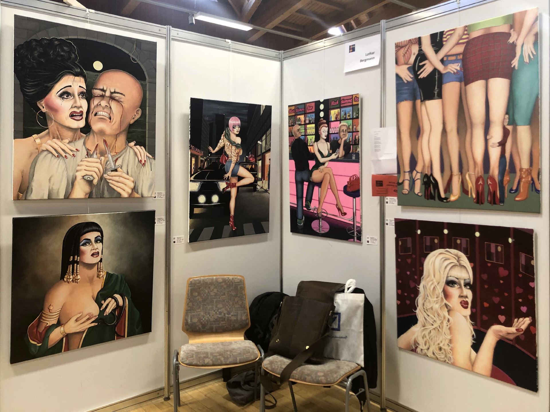 Lothar Bergmann, ein kontrovers diskutierter Künstler mit geschulten Auge. Was Männer wollen? "Ganz einfach" sagt Mann! Was Frauen wollen? "Nicht zu begreifen!" Auch Mann! - Nach Jahren eingespielt? Oder doch nicht? - Wer kokettiert? Wer unterdrückt? Wer hat die Macht? Wer die Hosen an, den Hut auf, wer das Sagen? Da ist die Genderdebatte in vollem Gange, nichts soll mehr eine Rolle spielen, der Geschlechterkampf unentschieden ausgehen, da zeigt der Künstler auf der regio art Gerolsheim, dass alles am Ende nur Fiktion gewesen sein könnte. Lothar Bergmann präsentiert, was er, Mann, sieht, vielleicht gar Männer allgemein? Sehen. - Sehen wollen? - So jedenfalls könnte Frau denken, dass Mann denkt, aber wenn Mann malt, könnte er auch anders denken, aber das weiß Frau ja nicht, denn Frau ist Frau und Mann ist Mann. So bleibt es dem Betrachter überlassen zu denken, was Mann, oder Frau, oder wer, oder was auch immer, denken könnte. Aber vielleicht denkt ja auch keiner! Hätte, könnte, sollte, wäre, wenn, oder so ähnlich, vielleicht wurde auch einfach nur gemacht! Gemalt! In Acryl, und voller Ausdruck, mit Witz, zwinkerndem Auge und voller Humor.
