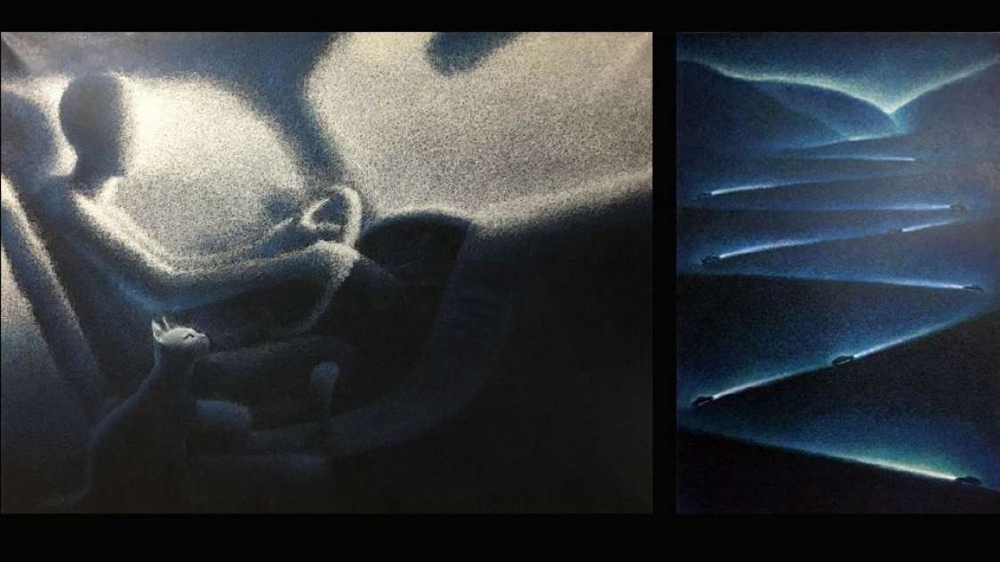 Ältere Airbrush-Arbeiten hängen neben den jüngeren Werken, fein gespritzten Acrylarbeiten. Man erkennt schnell: Seonghwan Ahn liebt Katzen. Mensch und Katze, das Spiel mit der Psychologie dahinter. Die Katze auf dem Beifahrersitz gibt Anlass zu Spekulationen. Es bleibt dem Betrachter überlassen, was er aus der Szene macht. In weiteren Werken der blau-weißen Phase geht es in mystischer Stimmung mit dem Auto in die Berge. Eine Geschichte baut sich im Kopf auf. Die Katze auf dem Beifahrersitz, eine Tour in die Berge.... Mir wird erzählt, man würde hierzulande Katzen sehr lieben. Tatsächlich sehe ich häufig streunende Katzen, weniger Hunde als Weggefährten. Vielleicht ist es das, was ihn fasziniert, dass Katzen kommen und gehen und nicht leicht zu halten sind. Katzen haben ihren eigenen Kopf, einen eigenen Willen, sind unbeugsam und nicht leicht zu durchschauen. Die Katze könnte für zwischenmenschliche Begegnungen im Allgemeinen stehen. Seonghwan Ahn lässt es offen.