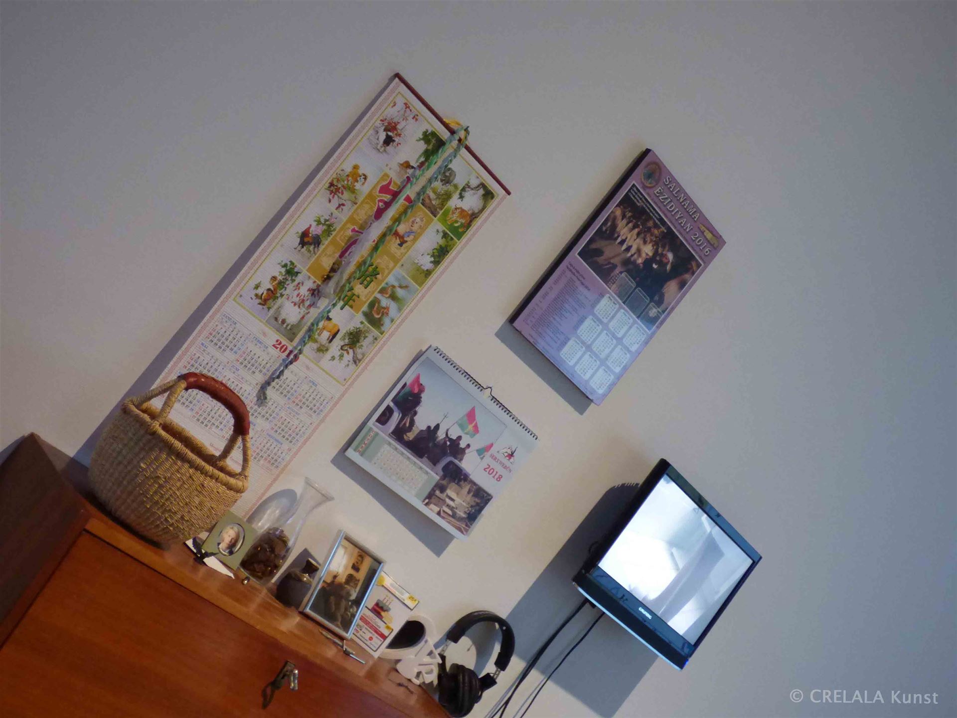 Beim Blick aufs Smartphone wird man nachdenklich. Ein Photo von der von Leyla Yenirce inszenierten Lebenswelt mit Kalendern unterschiedlicher Jahre aus unterschiedlichen Kulturen und Fotos der vielleicht wertvollsten Dinge, die man besitzt,… ein Smart TV an der Wand, mit eingesteckten Kopfhörern, wahrscheinlich ohne Mikrophon,… Alexa ist vielleicht schon integriert, vielleicht Siri, … die selbstreflektierende, das Selbst überwachende Videoarbeit über die letzten Tage der Malerin Rée auf Sylt vor ihrem Selbstmord, wie ein digitaler Fotorahmen zum Abspielen digitaler Erinnerungen in Endlosschleife,… Fotos geliebter Menschen, die einen geprägt haben und vielleicht noch immer prägen,… Fotos von Ahnen,… vielleicht mit den gleichen Genen,… Fotos der Kinder, denen man versucht Werte und eine Richtung mitzugeben, Kinder, die man moralisch vielleicht auf dem richtigen Kurs halten will, in den Stürmen der digitalen Möglichkeiten….