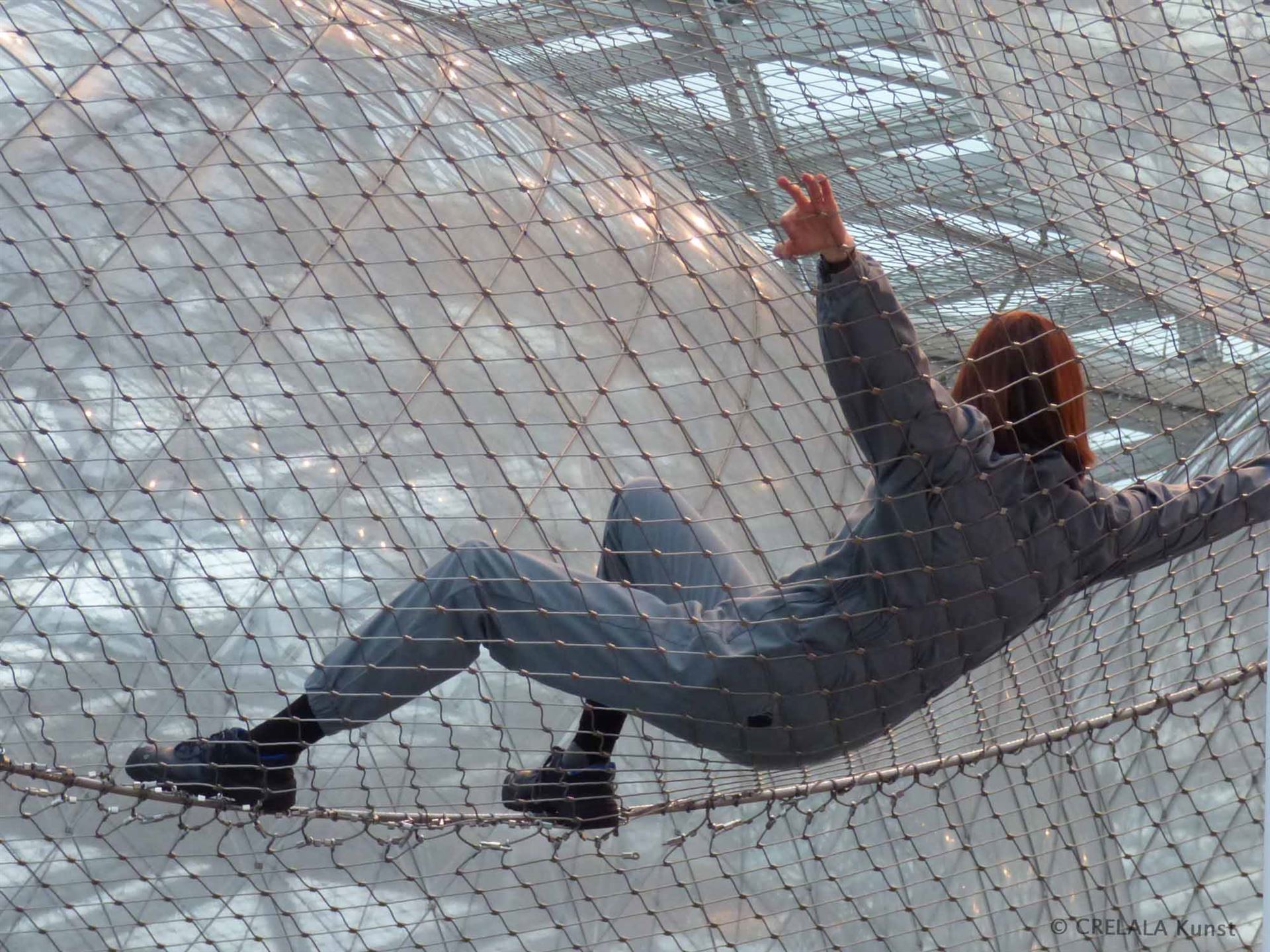 Vielleicht beeinflusst es auch fürs spätere Leben sich Ausnahmeberufe zu wählen, wo unter Extrembedingungen gearbeitet werden muss. In Netzen zu laufen, Schicht für Schicht, in schwindelerregender Höhe, nur gebremst von den Bubbles, den Luftblasen, die behindern. Man wird zum winzigen Teilchen in der Luft, umgeben von Aerosolen, oder auf Wassertropfen treffend, bzw. Moleküle. Und man treibt. Ohne Einfluss darauf zu haben wohin. Die Rahmenbedingungen gibt das Umgebende vor. Die Frage mit der man schließlich nach Hause gehen wird, ist: In wieweit ist all das steuerbar? Und wenn gesteuert, dann kontrollierbar. Fragen, mit denen man sich in Luft- und Raumfahrt tagtäglich auseinandersetzt, und in Erlebnisparks und Museen, wie unter anderem dem K21 darf man für einen kurzen Moment einmal selbst forschen und visionär träumen. Und Eintauchen in den Sternenstaub rund um Globus um sich treiben zu lassen in den vektoriellen Beschleunigungen und Verwirbelungen.