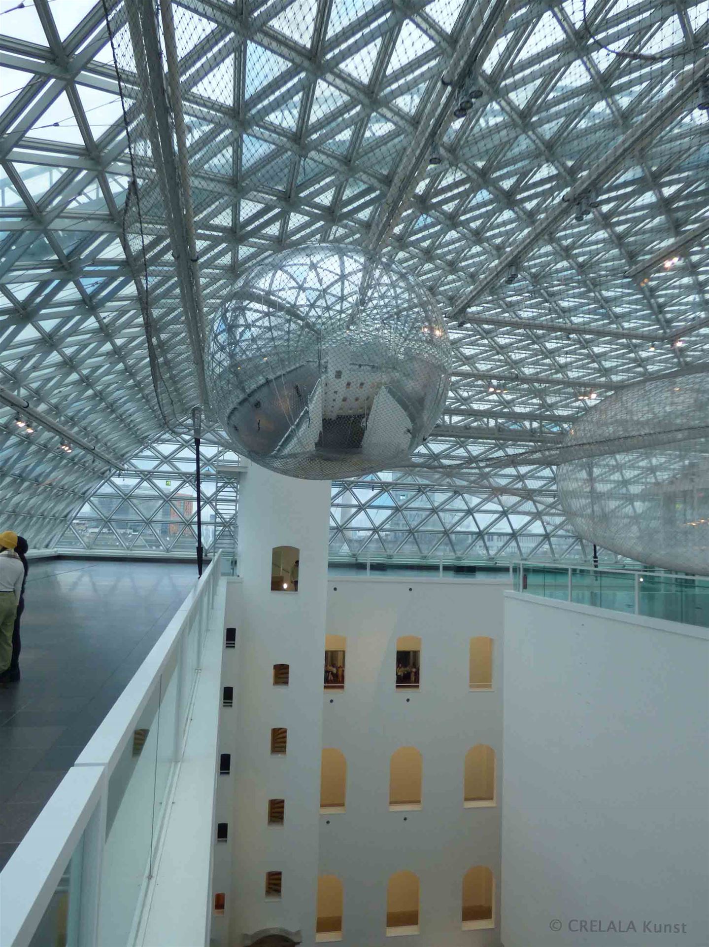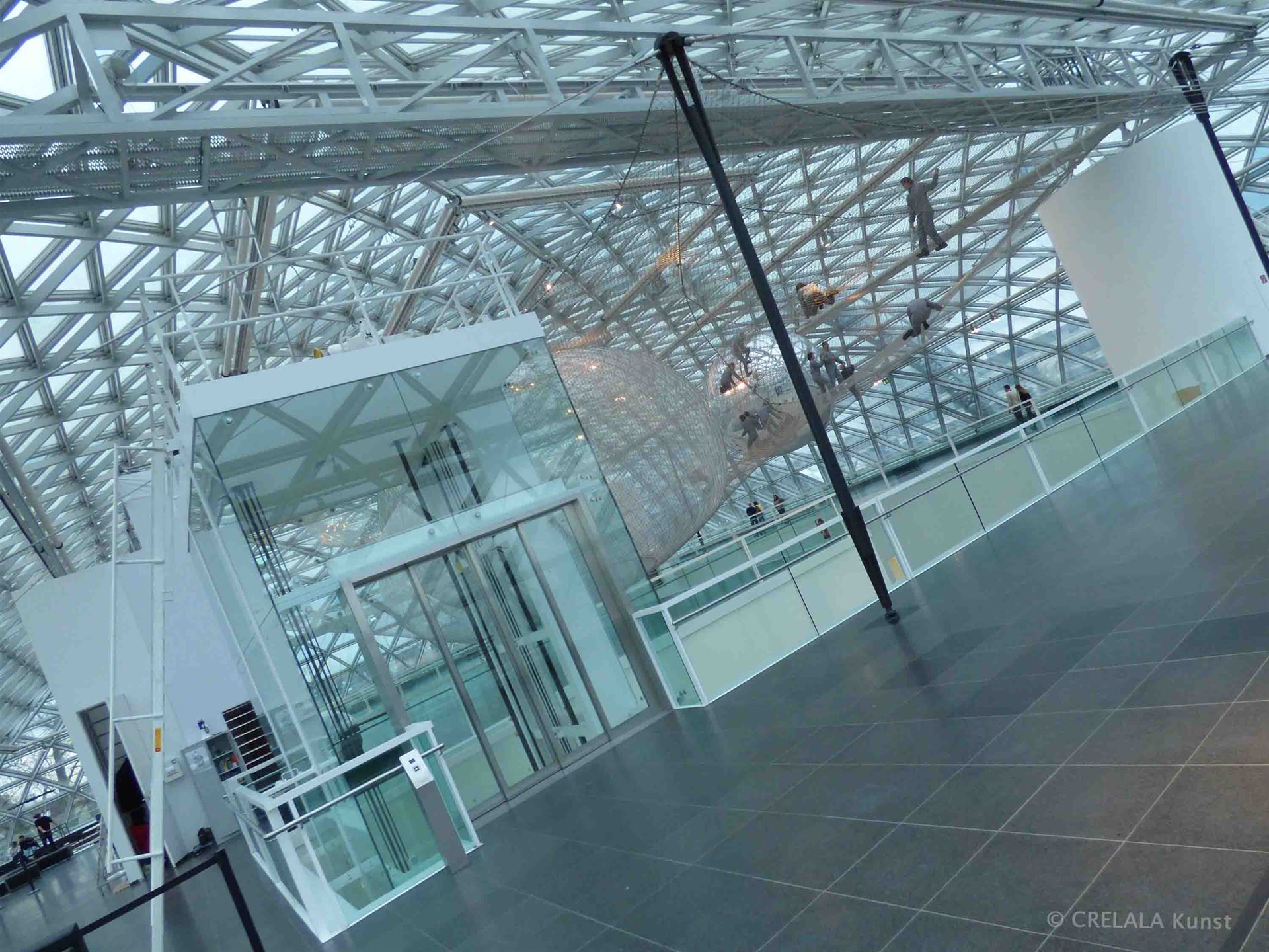 Saracenos Orbit ist ein Erfahrungsfeld für die Sinne und definitiv eine Erfahrung wert. Im K21 / Ständehaus in Düsseldorf, wo die Kunstsammlung NRW faszinierende Werke von Künstlern präsentiert, die sich quergedacht mit Netzen, deren Erforschung und deren Weiterentwicklung beschäftigen. Kurz: Sich mit den Zusammenhängen der Welt beschäftigen und sie visualisierbar machen. Um auch die nächsten Generationen zu inspirieren und ihnen auf die Sprünge zu helfen zum Weiterdenken. Das K21 in Düssledorf mit Tomas Saracenos Stahlnetzen „In Orbit“: Auf jeden Fall eine Reise wert.