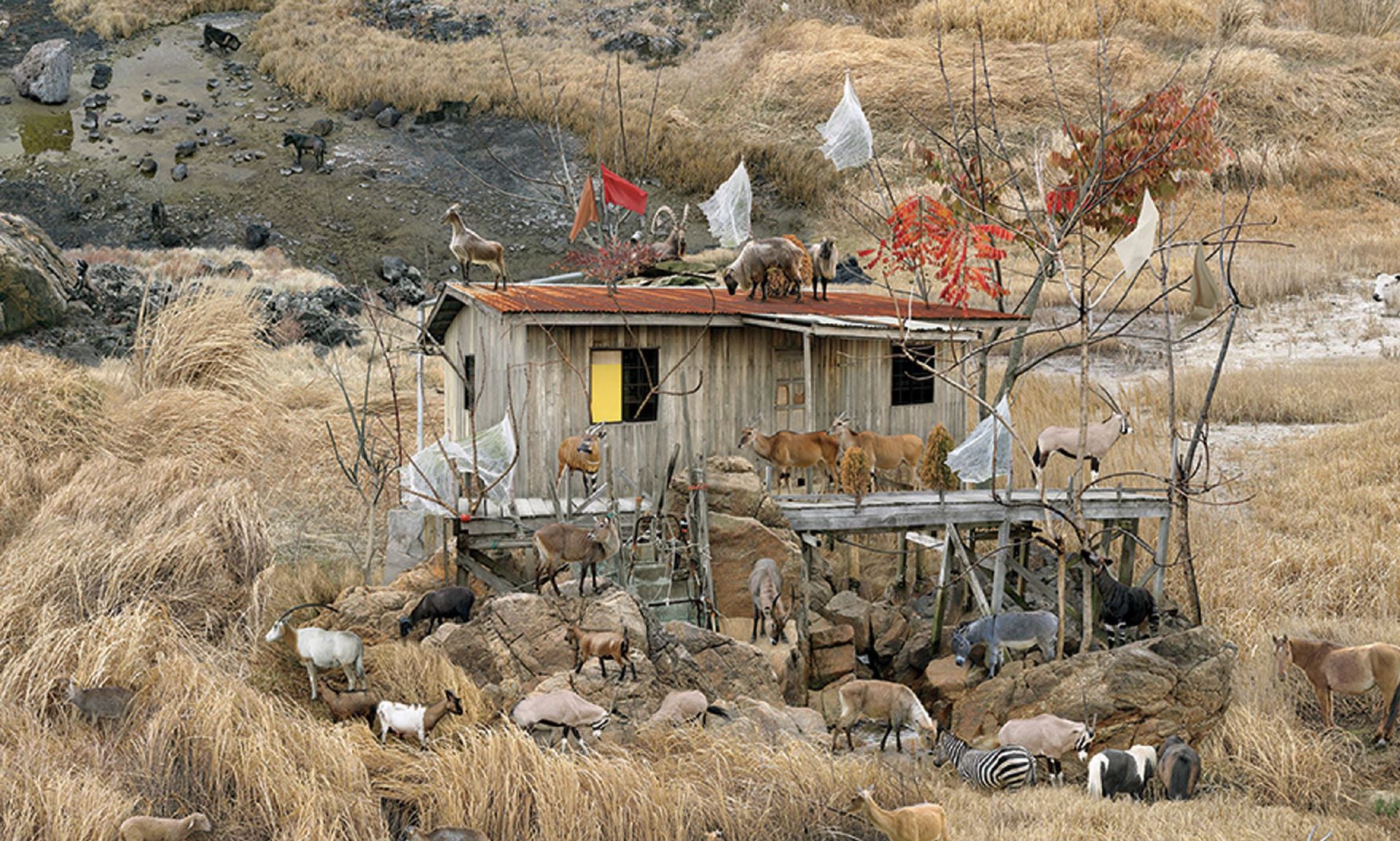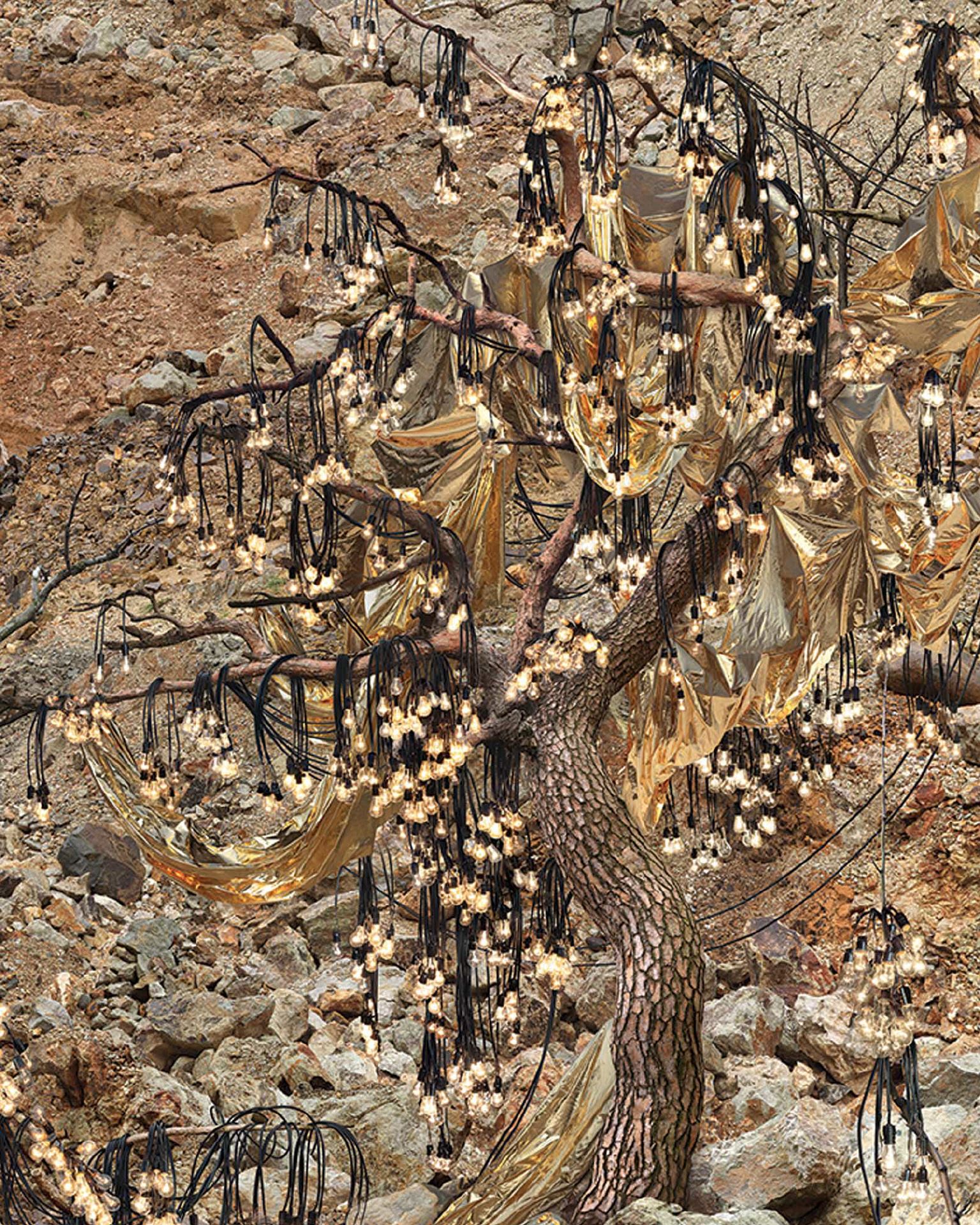 In der Welt der Börsenmakler und Financiers muss man vielleicht selbiges sein, um die Kursschwankungen, zusammengebrochene Märkte und die eigene Persönlichkeit zu erkennen. Die Künstlerin ist weit gefahren, um in Korea goldfarbenes Erdreich zu finden, GOLD, das Symbol der Märkte. Gold, um dem Bild die Tiefe zu verleihen, die es braucht. Immer wieder tauchen goldfarbene Elemente auf, die für das Gold der Börse stehen. Die Kursschwankungen ganz offensichtlich das Kabelgewirr der Leuchten am trostlosen Geäst. Mal, heller mal weniger hell, je nach Kursschwankung. Mitten in der Landschaft die Tiere, die wieder für die einzelnen Persönlichkeiten stehen, wer für wen steht wird nicht verraten. Die, um die es geht, dürfen sich selbst wiedererkennen.