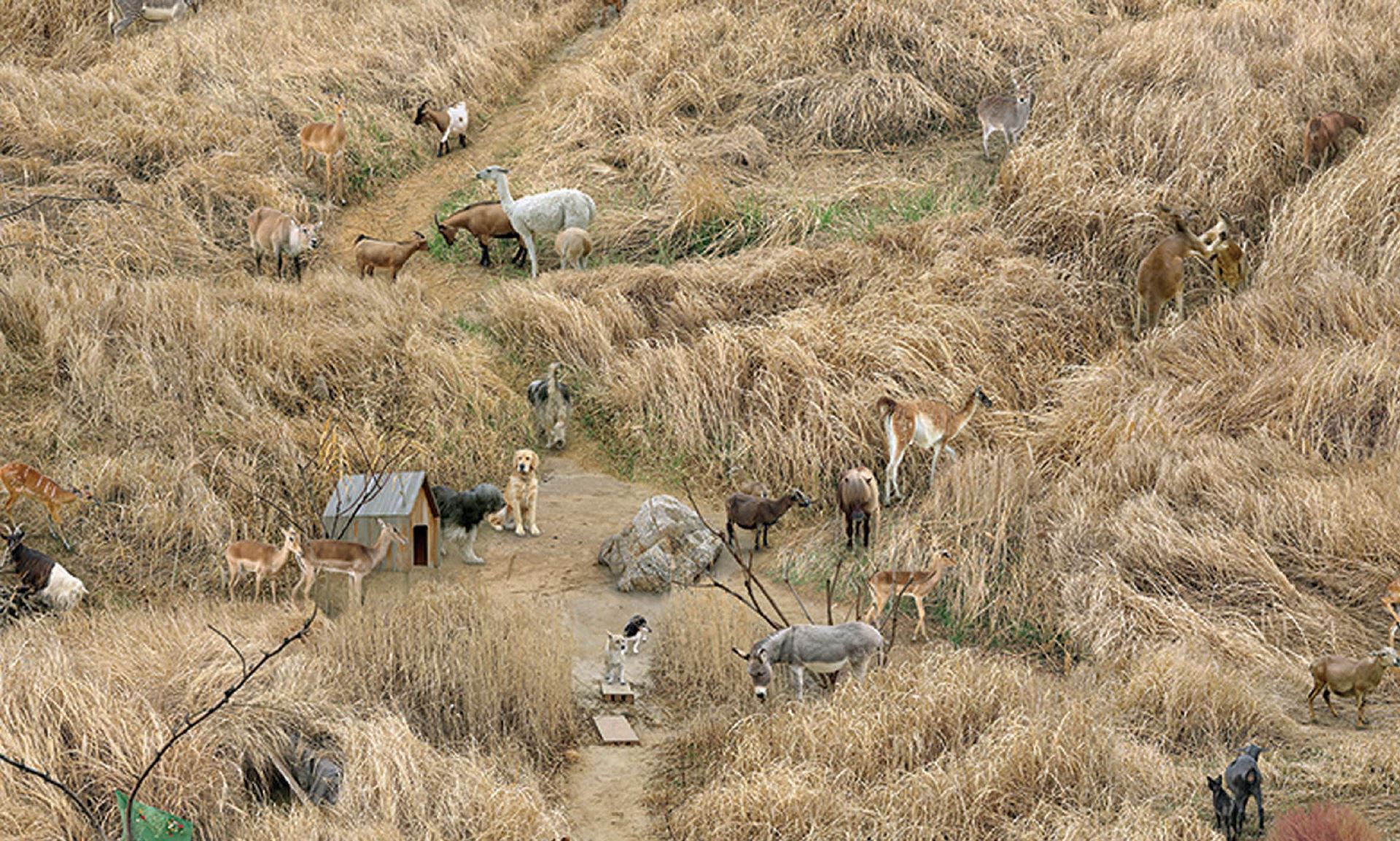 Und die Universitäten in einer weiten Graslandschaft hat Won Seoung Won als Hütten dargestellt. Es gibt die großen Häuser mit unzähligen Professoren, dargestellt durch verschiedenste Tiere auf verschiedenen Ebenen. Und die freien Universitäten, mit wenig Mitteln und ohne große Gebäudekomplexe. Frei im Geist zu bleiben, heißt auch frei in der Lehre zu sein. Antilopen, Hirsche, Ziegen, Horntiere in Wons Arbeiten sind immer die, die Macht ausstrahlen. Leittier, Herde, Masse ... die psychologischen Beziehungen beschäftigen Won Seoung Won sehr. Das ist in ihren tiefgründigen Arbeiten immer wieder zu erkennen.