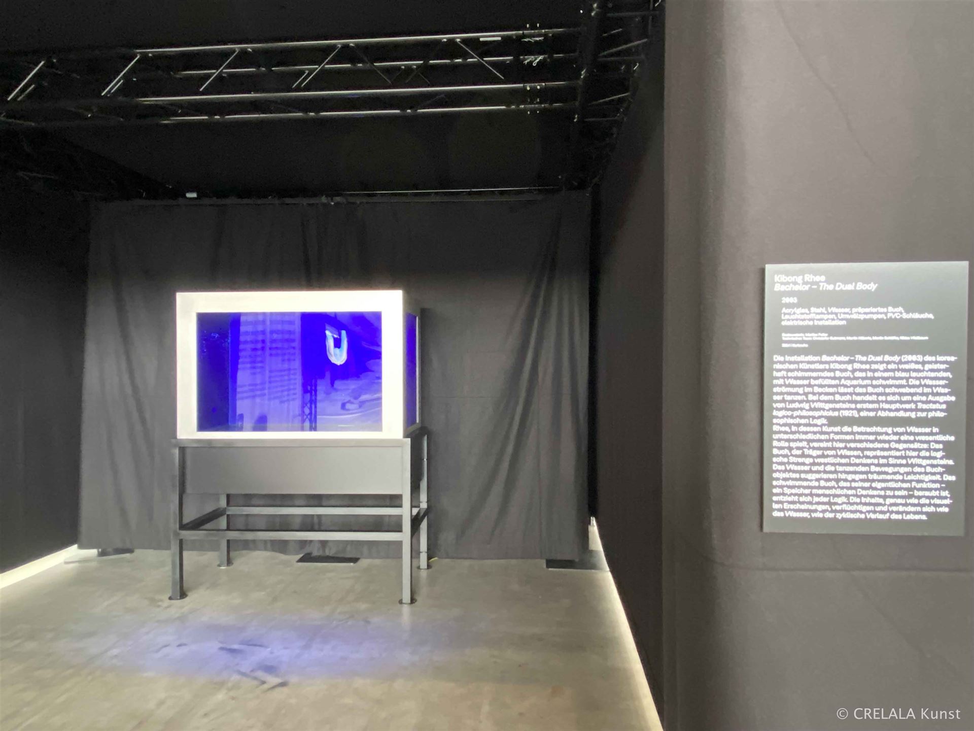 Bei Kibong Rhees „Bachelor“ fliegt ein Buch durch blauen Raum, ein tief blaues Wasserbecken… Tauchbecken, Experimentierfeld. Ludwig Wittgensteins „Tractatus logico philosophicus“ (1921) ist der Titel des Buches, so heißt es in der Beschreibung. Das Buch selbst, zusammengeklappt, im Abgleich, wie der Starwars Imperial Shuttle, oder der Dreizack im Ukraine Wappen. Ein Urzeitwesen in den Untiefen der Blauen Tiefe. Beabsichtigt, oder unbeabsichtigt, es ist das Phänomen der Kunst Entsprechungen finden zu wollen, und zu begreifen, wie der Künstler so „tickt“.