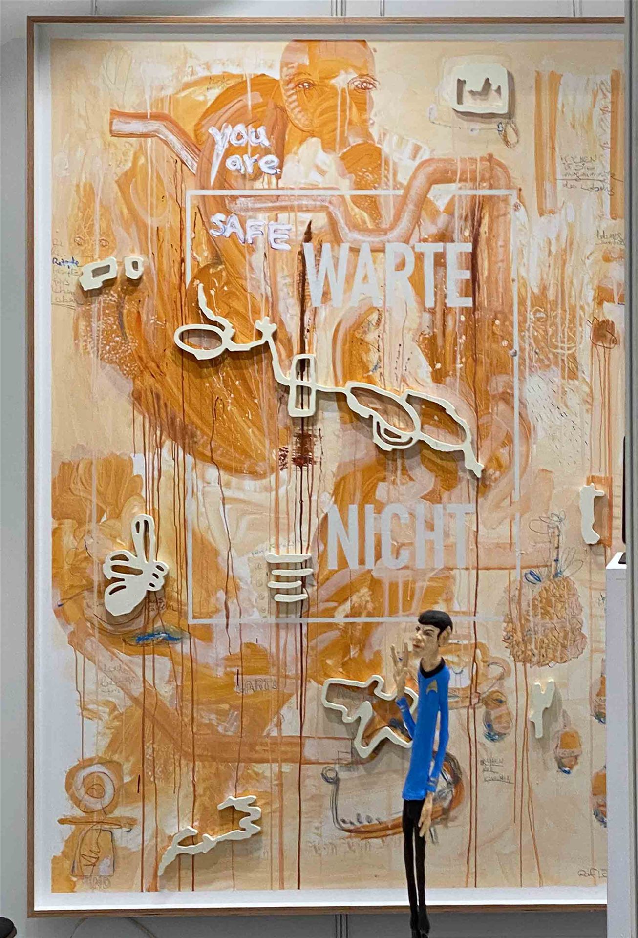 Bedürfnisse sind auch Ralf Löhrs Thema. Unter anderem. Das menschliche Sein, Dasein wird karikativ in Szene gesetzt, gedruckt, verlaufen, gezeichnet und offenbarend. Die Albträume der eigenen Gedankenwelt präsentieren sich als kleine Monster. Ein Homer, gearbeitet im verlorenen Schnitt, ist nur die tumbe Hülle einer jagenden Katze, Tom von Tom und Jerry, wie man ihn noch in Erinnerung hat aus den alten Comic-Zeiten beim öffentlich-rechtlichen Fernsehen, vielleicht im Nachmittagsprogramm, Sommer-Ferienprogramm, wenn Zeit totgeschlagen werden musste. Gefüllt mit Sinn oder Unsinn. Je nachdem. Tom, der Jäger, der vielleicht von Homer geschützt wird, bevor er sich aus der schützenden Hülle herausarbeitet. – Gewolt? – Und seine Großformate in grün, mit einem Gefühl von Wald und Natur, sowie orange, wie direkt aus der Wüste, in der man sich in der Hitze des Tages ein Safe Space suchen will, beide mit Hintergrundbeleuchtung, sind in jedem Haus ein denkwürdiger Blickfang.