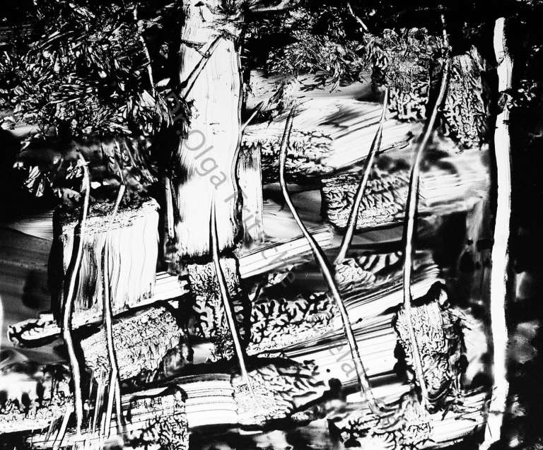 *Cliché verre ist eine halbfotografische, kameralose Methode. Das Motiv wird auf eine, mit schwarzer Farbe bedeckte Glasplatte als Negativ aufgetragen. Die Glasplatte wird danach auf ein lichtempfindliches Papier in der Dunkelkammer gelegt, belichtet und das Papier analog entwickelt. Durch diese Methode erhält man das Positiv des Bildes, die Fotografie.