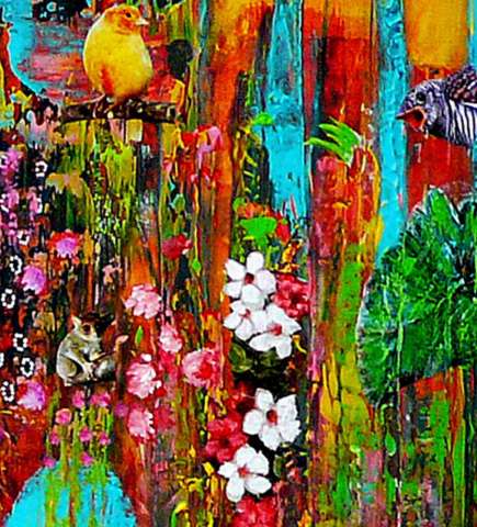 Das Kunstwerk "Die Trauminsel" wurde in Acryl mit Collageteilen aus Papier auf Holz gemalt. Das Gemälde hat ein Außenmaß von 50 cm x 50 cm x 2 cm.