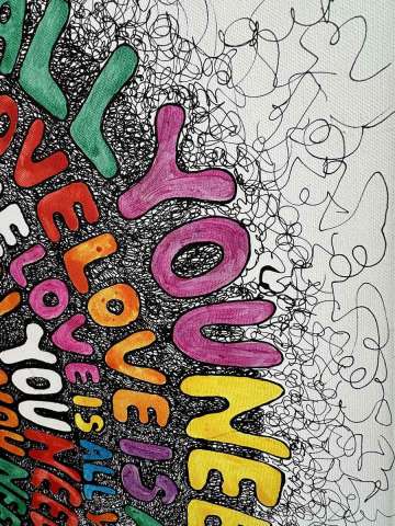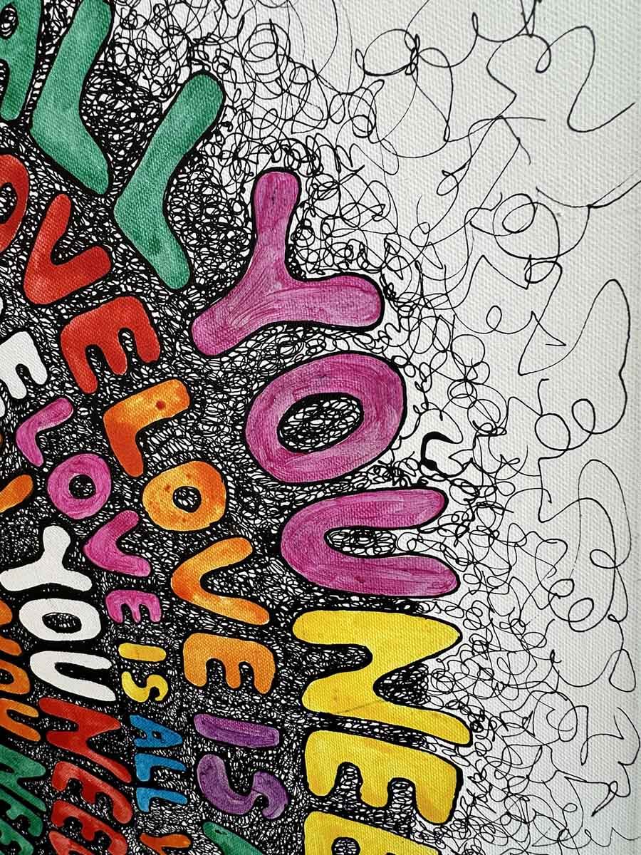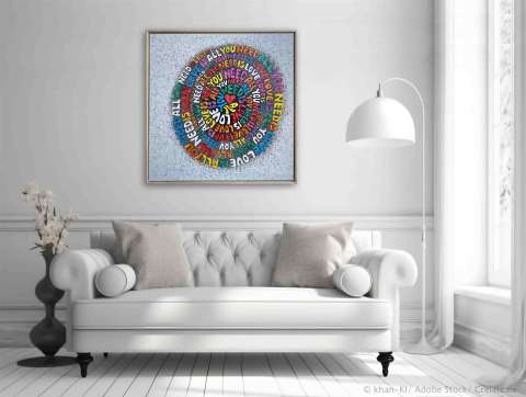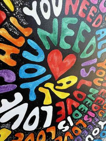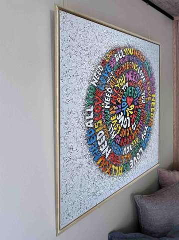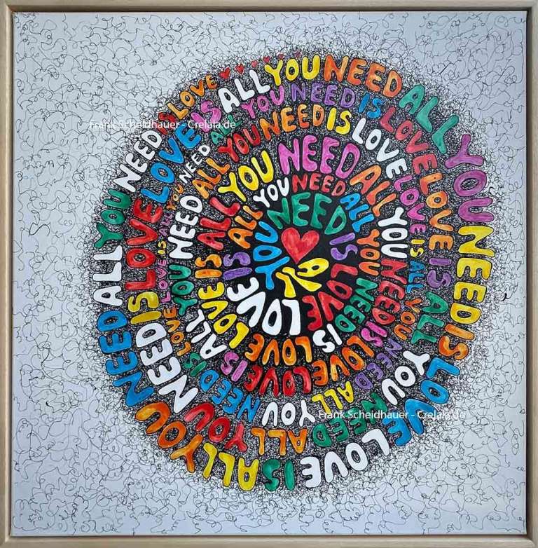 Das Kunstwerk "All you need is love" wurde in Acryl auf Leinwand gemalt. Das Gemälde hat ein Außenmaß von 80 cm x 80 cm x 2 cm.
