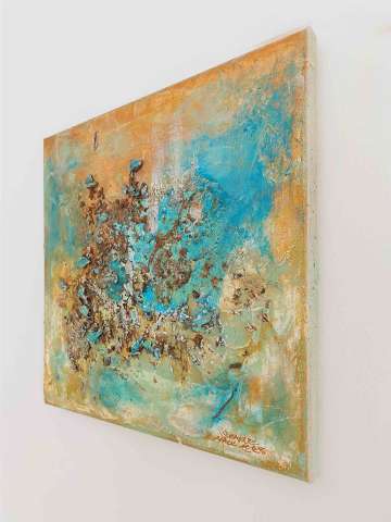 Das Kunstwerk "Die Versuchung" wurde in Mixed Media und Acryl auf Leinwand gemalt. Das Außenmaß des Kunstwerkes beträgt 30 cm x 30 cm x 1,6 cm.