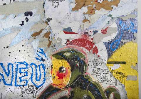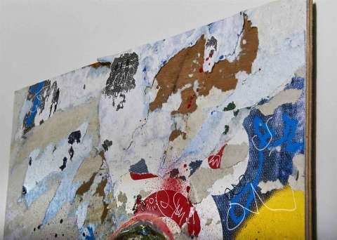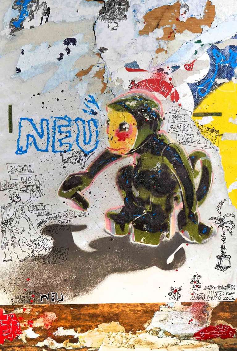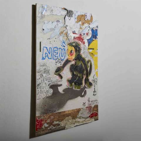 Das Kunstwerk "Affe" ist eine Stencil Arbeit auf Papier in Acryl und Mixed Media auf alter 18/1 Holzplatte (upcycling). Das Gemälde hat ein Außenmaß von 40 cm x 60 cm x 1 cm .