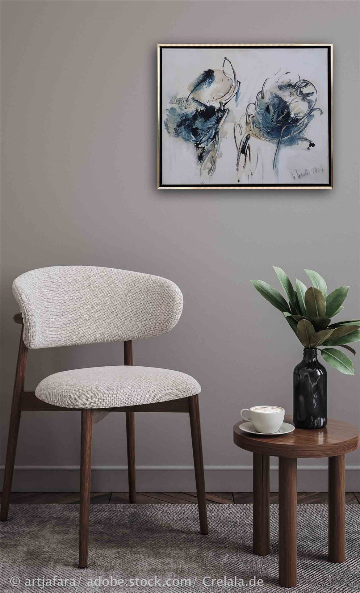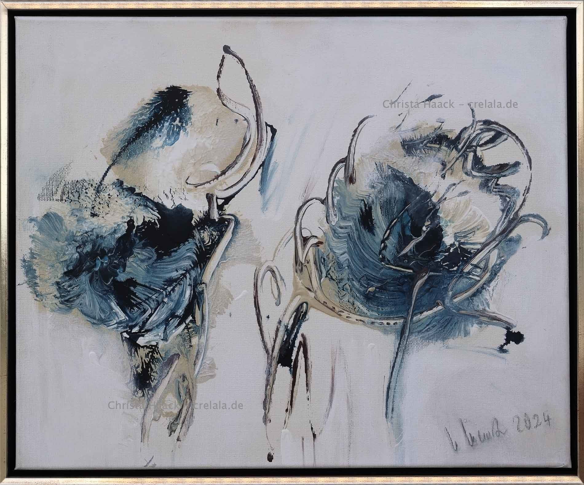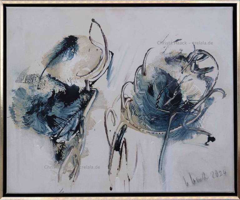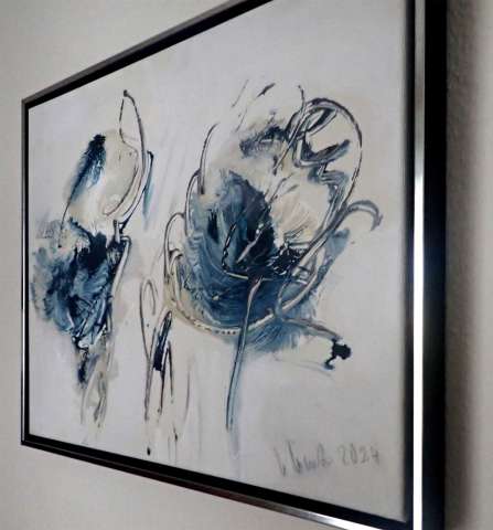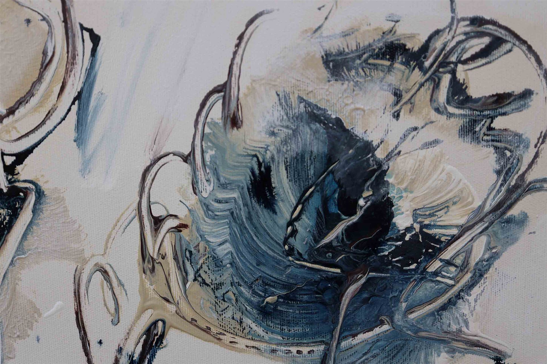 In diesem faszinierenden abstrakten Acrylbild entfaltet sich eine harmonische Komposition aus blau, weiß, beige und schwarz die den Betrachter in eine Welt voller Interpretationen führt. Die tiefen Blautöne strahlen eine beruhigende Gelassenheit aus, während die lebendigen Beigetöne an die Frische der Natur erinnern und ein Gefühl von Vitalität vermitteln. Die weißen Akzente durchbrechen die dunkleren Farben und schaffen einen Kontrast, der Licht und Raum in das Bild bringt, sie wirken wie Lichtstrahlen.
