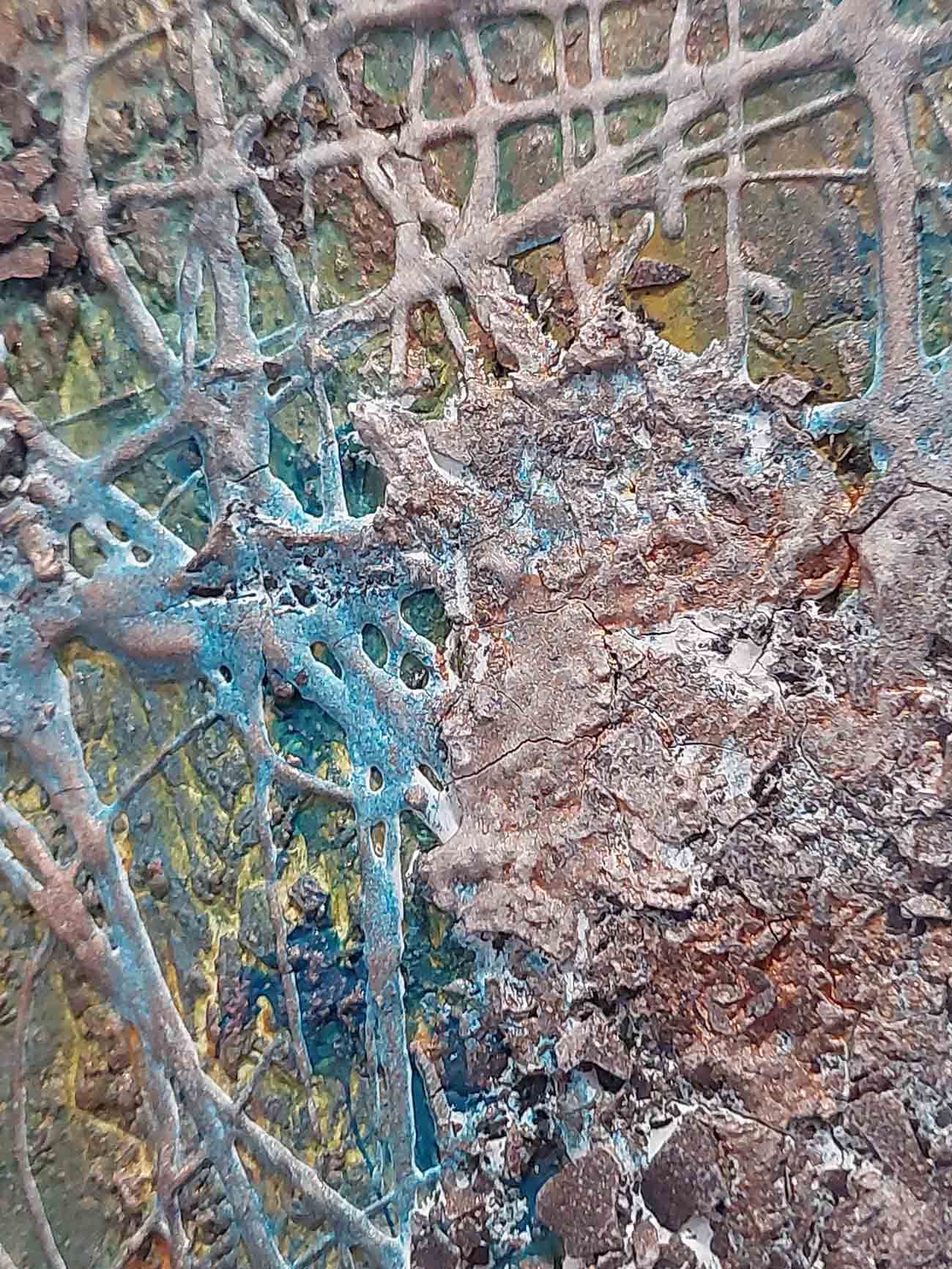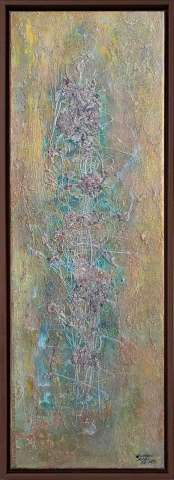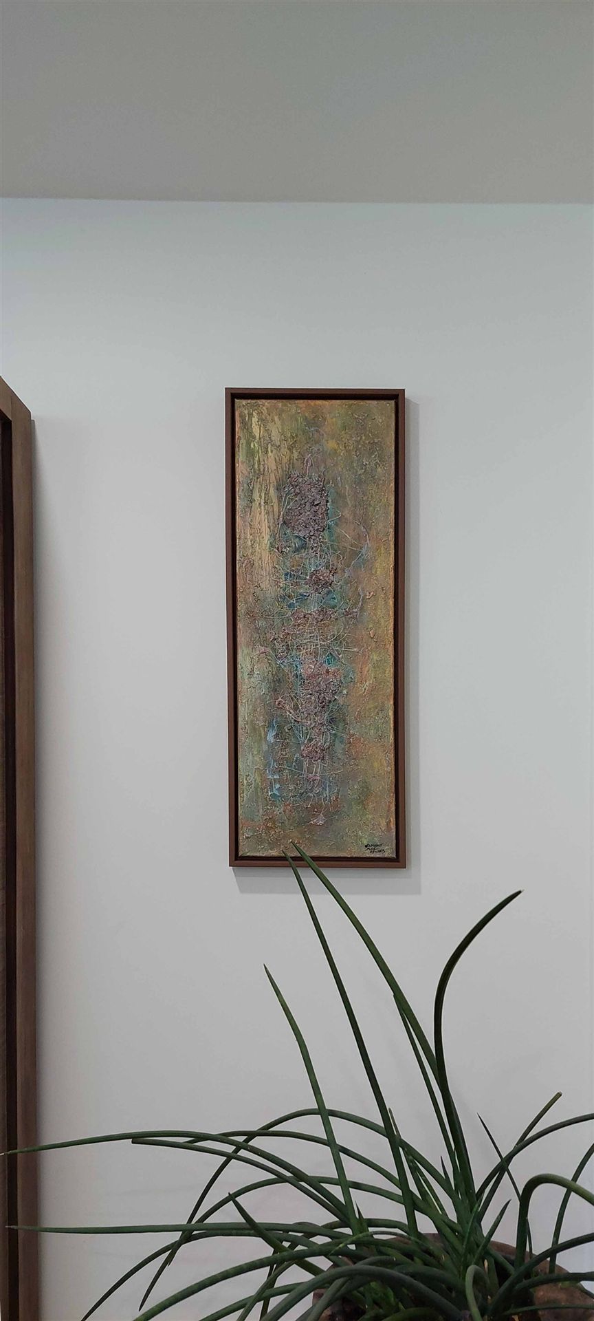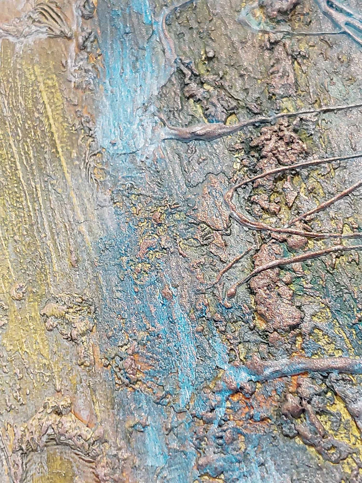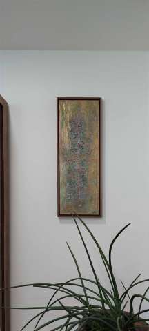 Das Kunstwerk "Der goldene Weg" wurde in Mixed Media und Acryl auf Leinwand gemalt. Das Außenmaß des Kunstwerkes beträgt 30 cm x 90 cm x 1,6 cm.