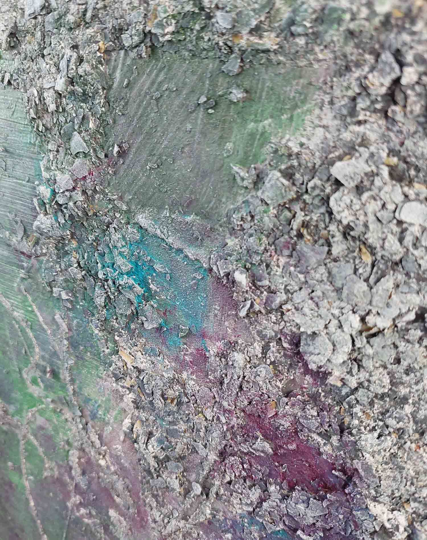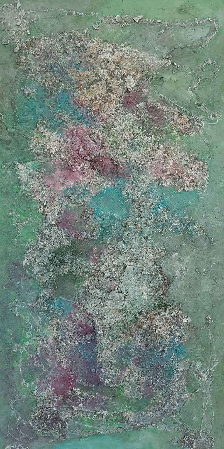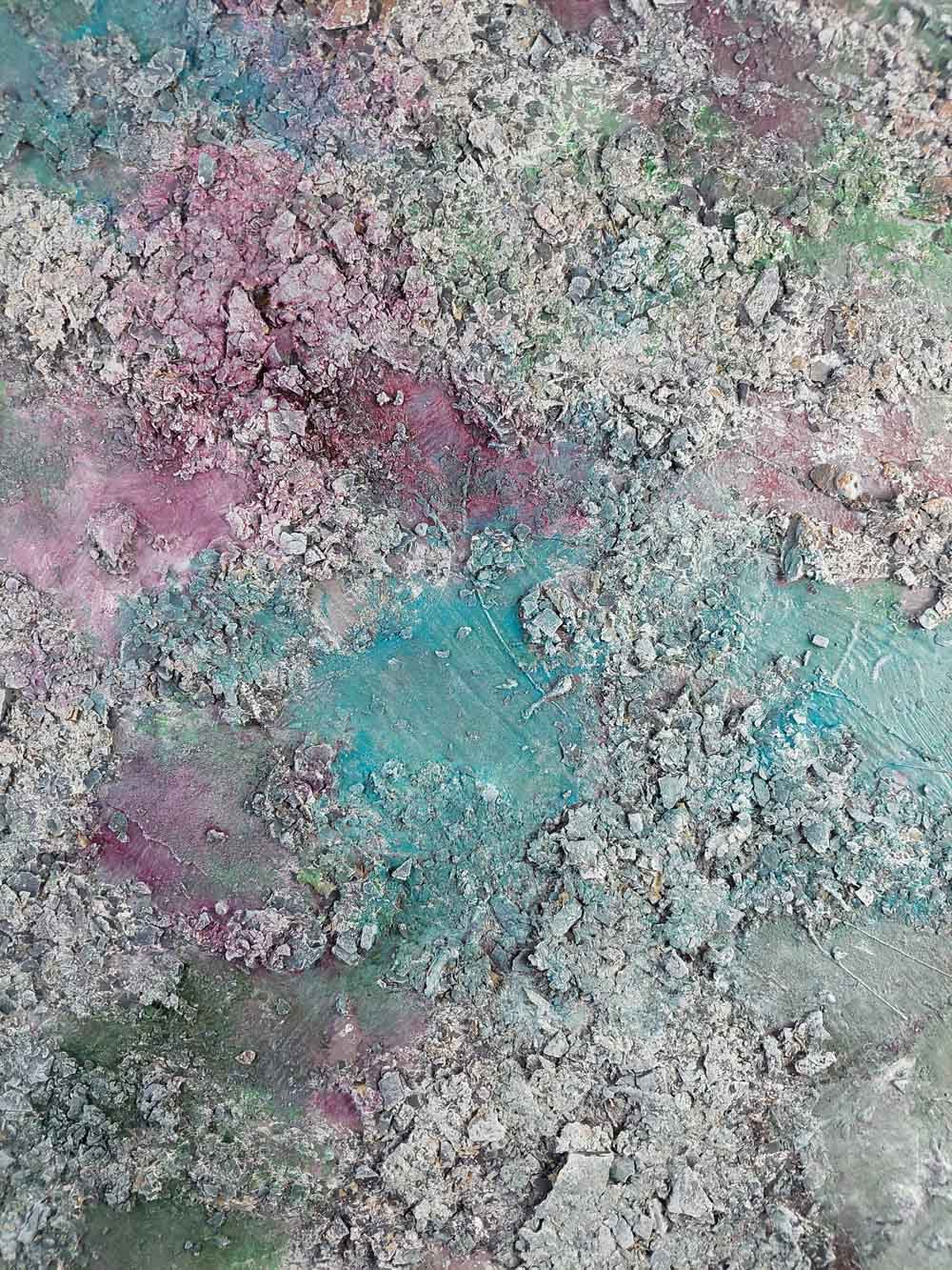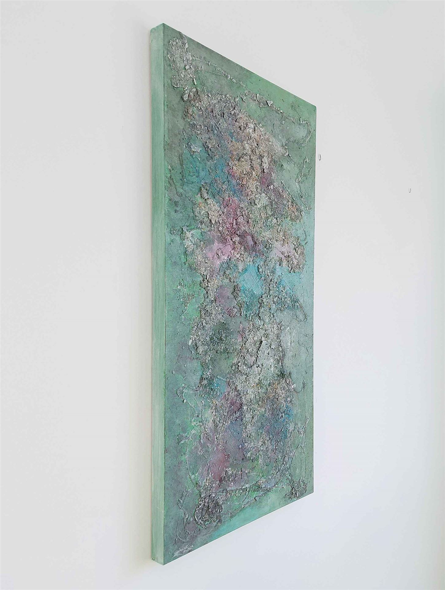 Das Kunstwerk "Die Evolution" wurde in Mixed Media und Acryl auf Leinwand gemalt. Das Außenmaß des Kunstwerkes beträgt 50 cm x 100 cm x 3,6 cm.
