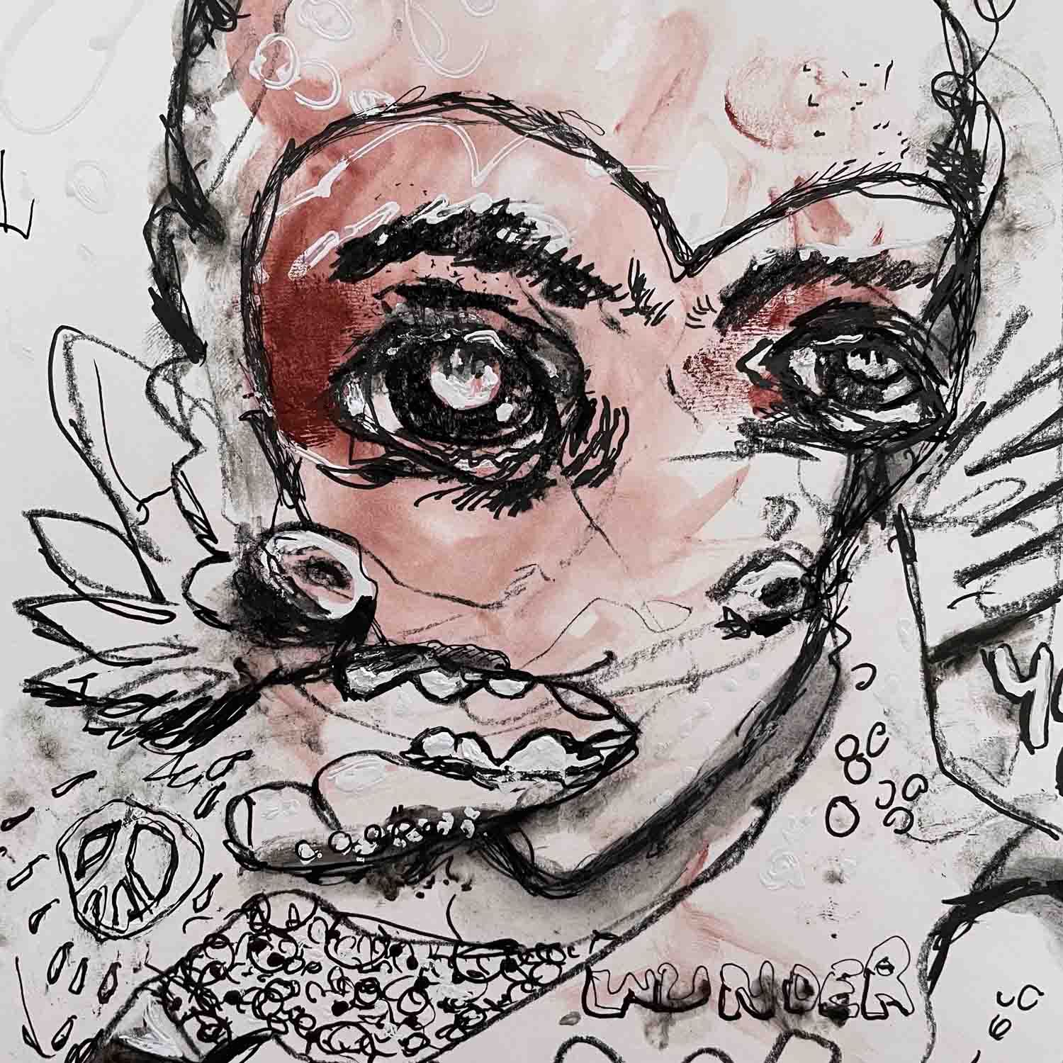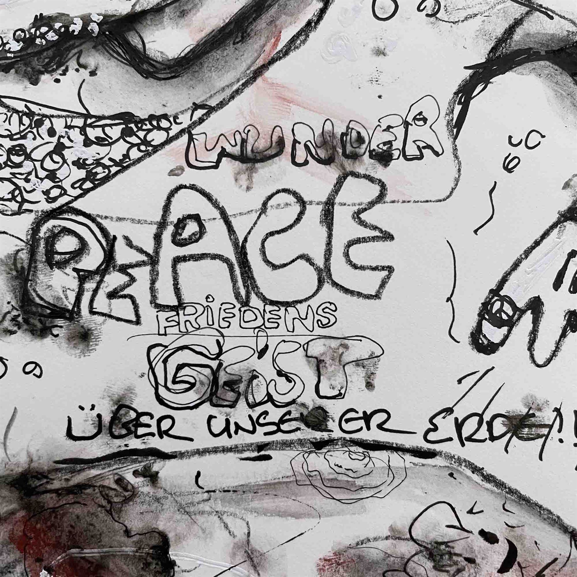 Das Kunstwerk "Friedensgeist"wurde in Kreide, Kohle, Fineliner und Tusche auf Hahnemühle Papier gemalt. Veredelt wurde das Werk durch 2 farbigen Siebdruck in weiß/rot . Das Außenmaß dieses Unikates beträgt 25 cm x 34 cm. Die Zeichnung wird gerahmt mit Museumsglas angeboten.
