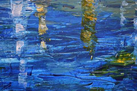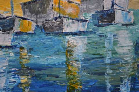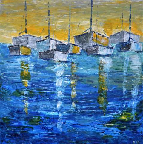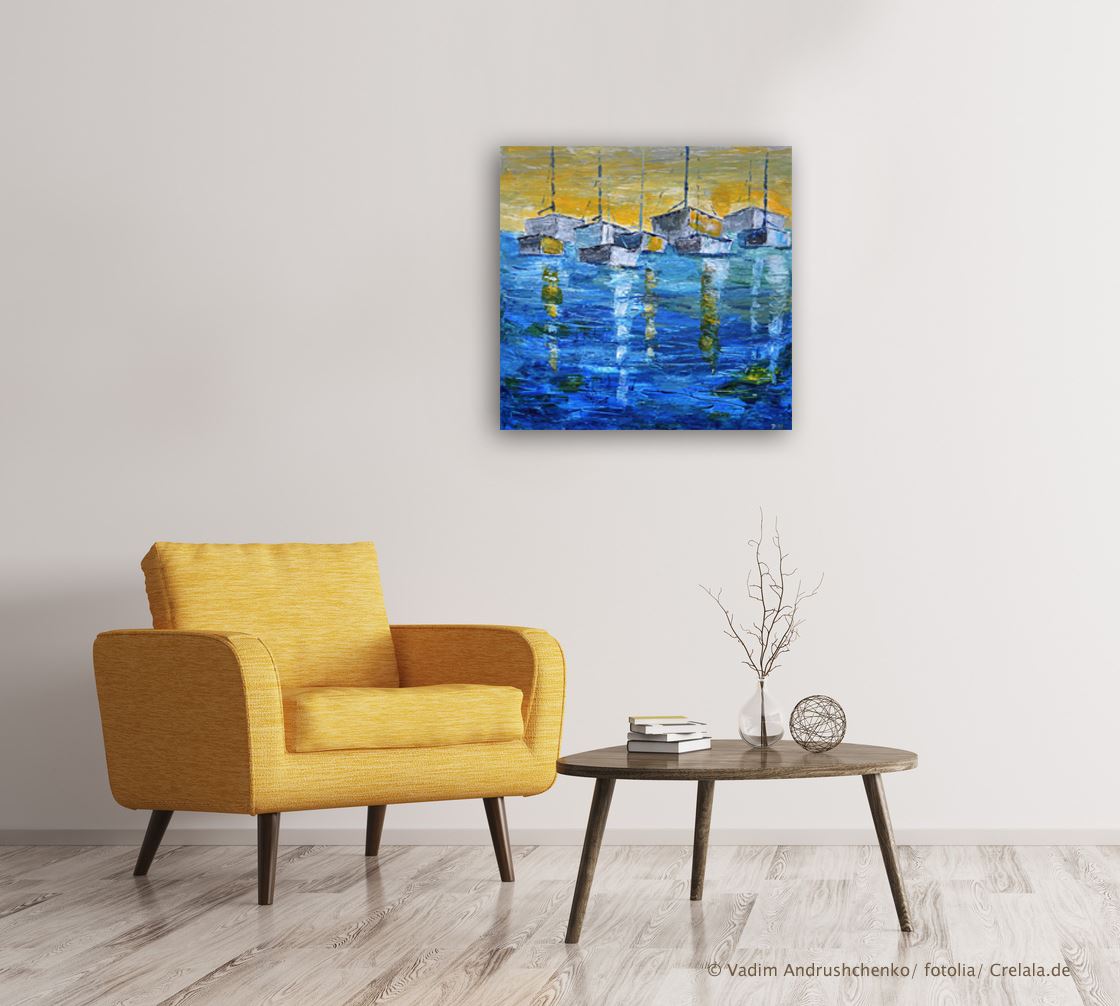 Das Kunstwerk "Boote in Blau/Gelb" wurde in Acryl auf Leinwand gemalt. Das Außenmaß dieses Unikates beträgt 70 cm x 70 cm x 1,8 cm.
