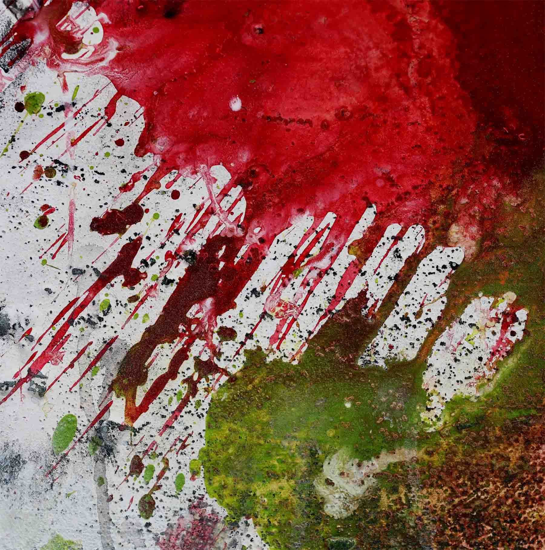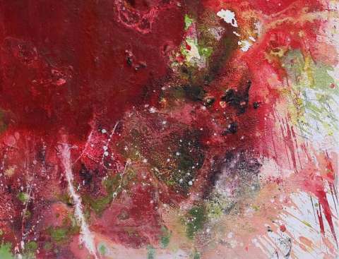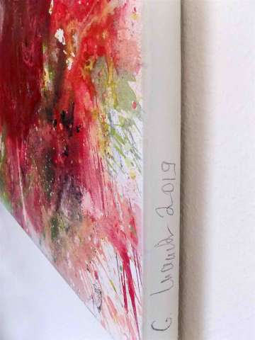 Dieses farbenfrohe Kunstwerk hat rote Highlights in der Mitte und Bereiche mit dicker Textur, die verstreut sind. Die Lackierung wird mit einer letzten Schutzlackschicht abgeschlossen und alle Seiten sind weiß lackiert, sodass kein Rahmen erforderlich ist. Fertig zum Aufhängen und auf der Seite signiert.