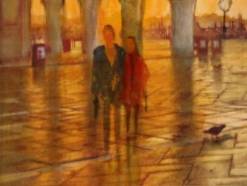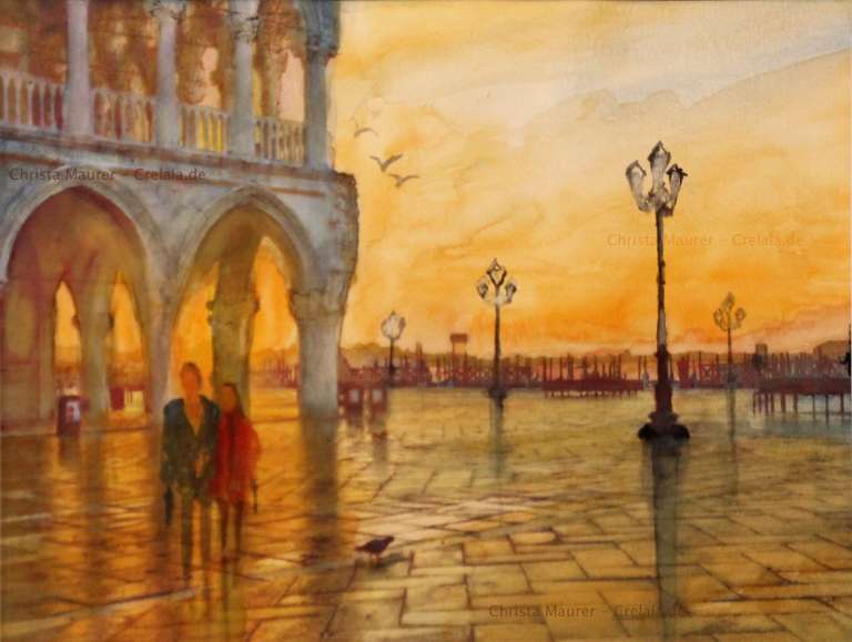 Das Kunstwerk "Markusplatz" wurde in Aquarell auf Aquarellpapier gemalt. Das Außenmaß dieses Unikates beträgt 30 cm x 40 cm.