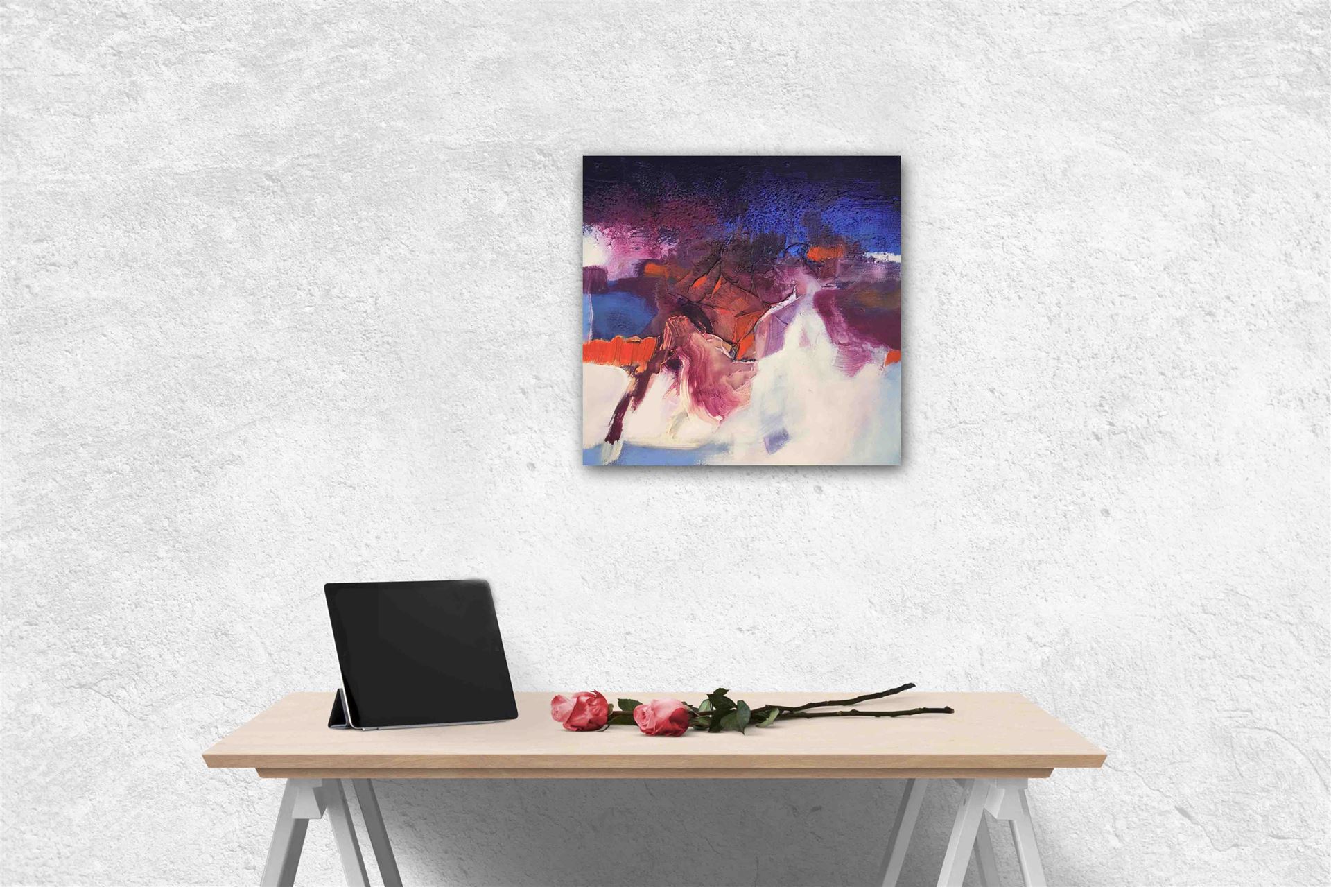 Das Kunstwerk "Erhebung" wurde in Mixed Media auf Leinwand gemalt. Das Außenmaß dieses Unikates beträgt 50 cm x 50 cm x 3,5 cm.