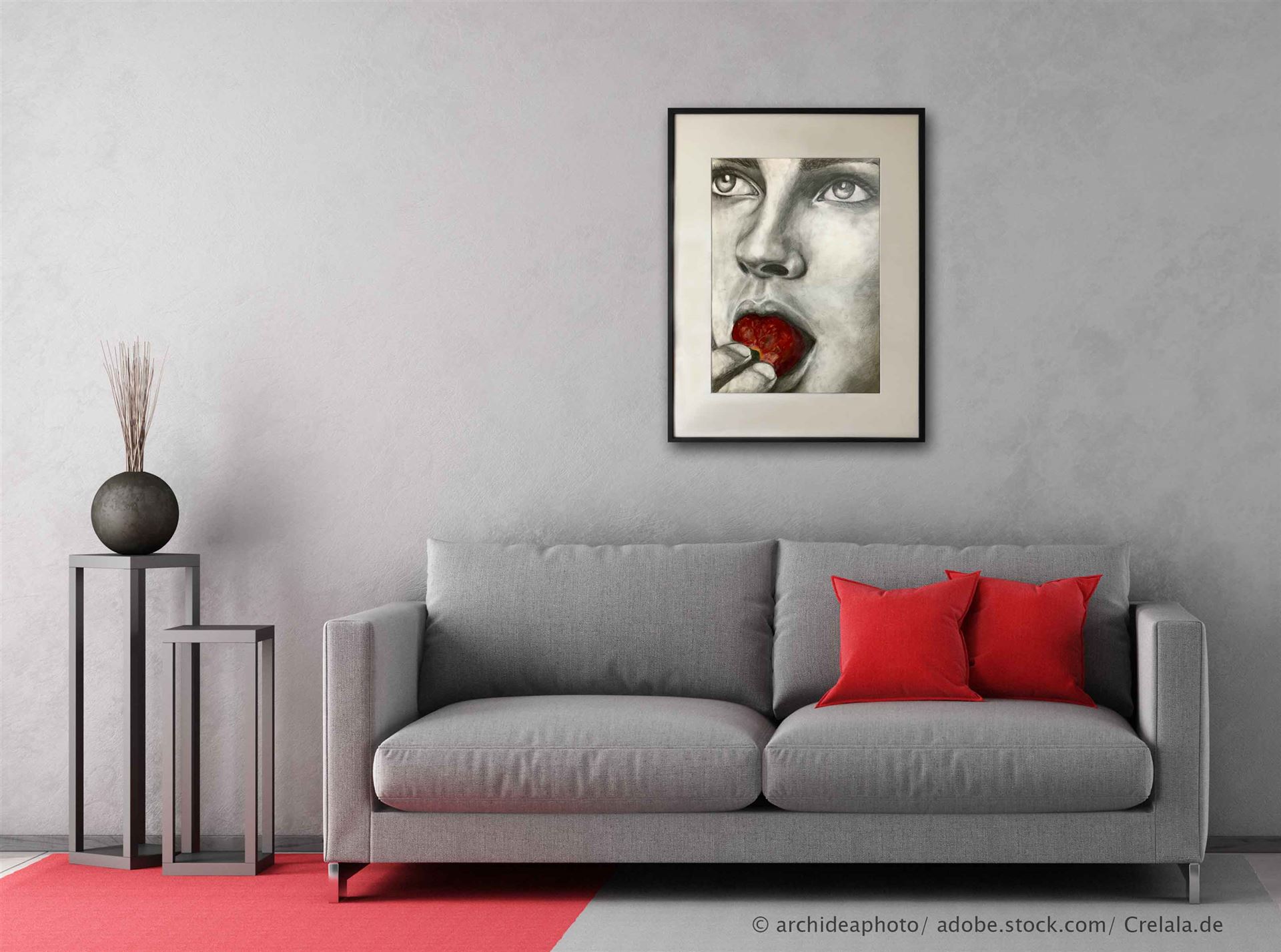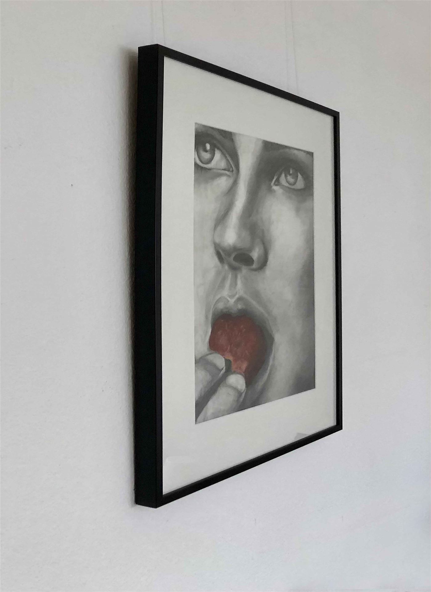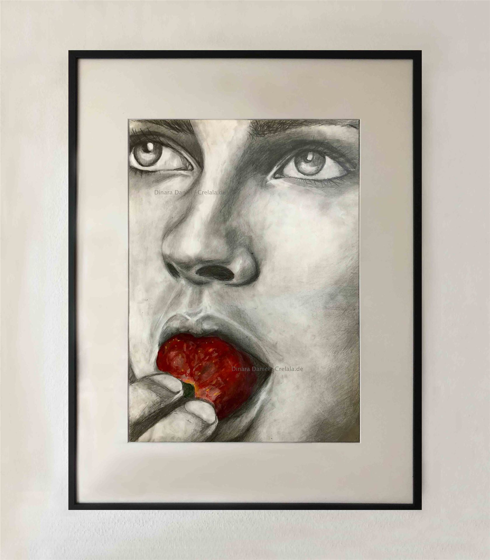 Das Kunstwerk "Das Mädchen das Erdbeeren liebt" wurde in Bleistift und Aquarell auf Papier gemalt. Das Unikat wird in einem Glasrahmen mit Passepartout zum Verkauf angeboten. Das Außenmaß dieses Unikates beträgt 58 cm x 42 cm cm und gerahmt 81 cm x 61 cm x 2 cm.
