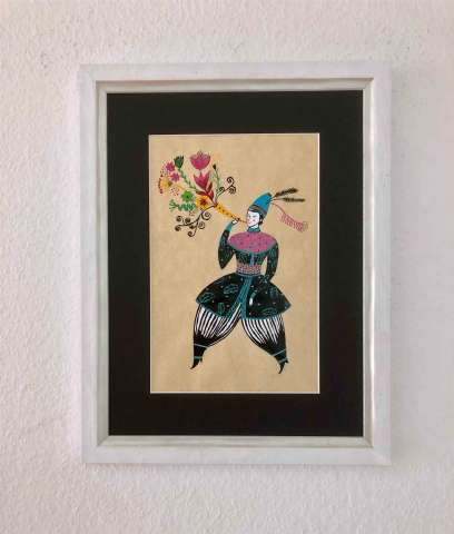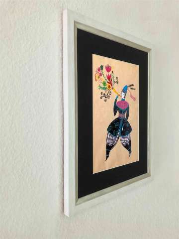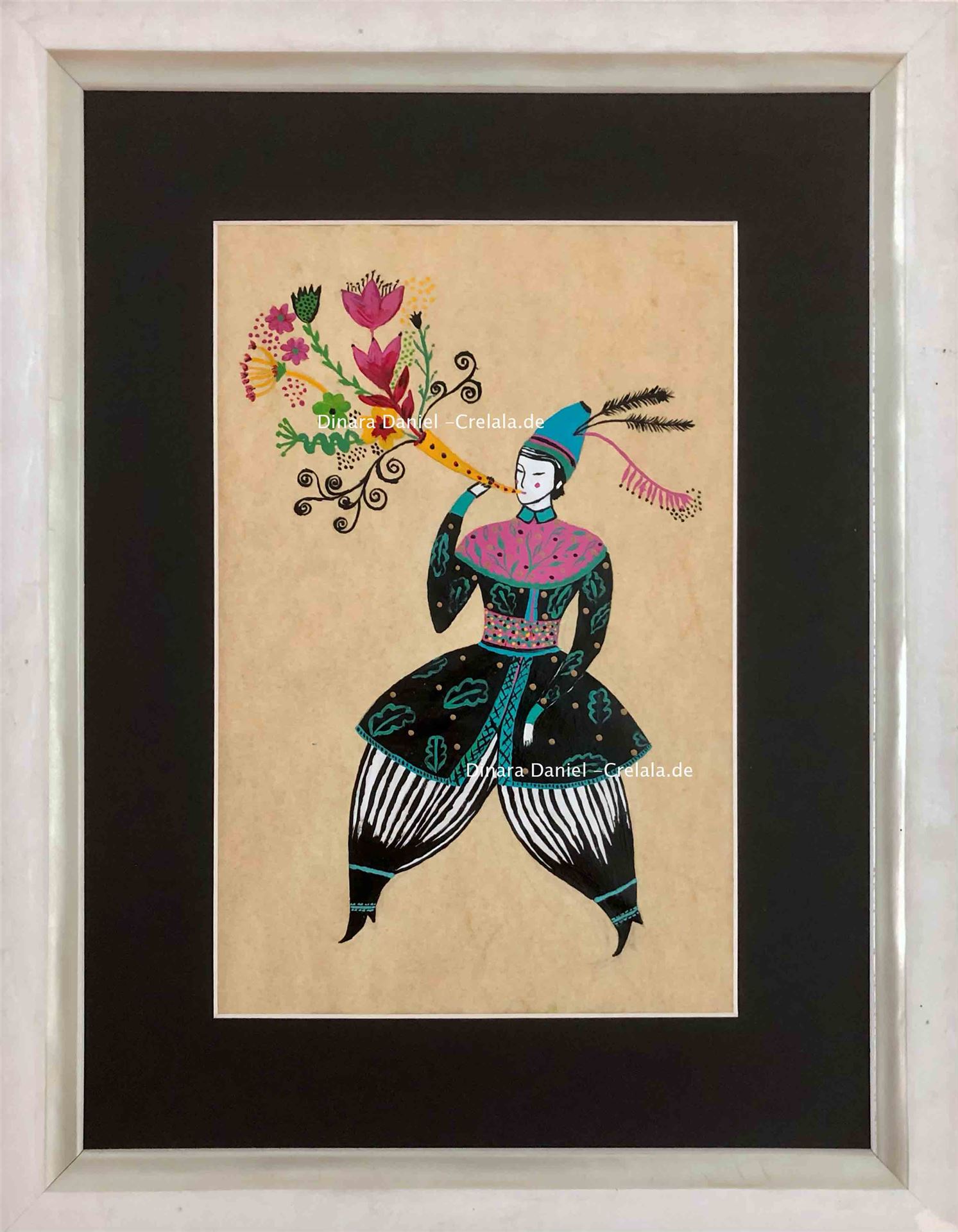 Das Kunstwerk "Der Blumentrompeter" wurde in Acryl auf Papier gemalt. Das Unikat wird gerahmt mit Passepartout zum Verkauf angeboten. Das Außenmaß dieses Unikates beträgt 30 cm x 20 cm x 2 cm und gerahmt 45 cm x 35 cm x 2 cm.