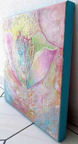 Das Kunstwerk "Erinnerungen" wurde in Acryl mit Mischtechnik gespachtelt auf Leinwand gemalt. Das Außenmaß dieses Unikates beträgt 50 cm x 50 cm x 4 cm.