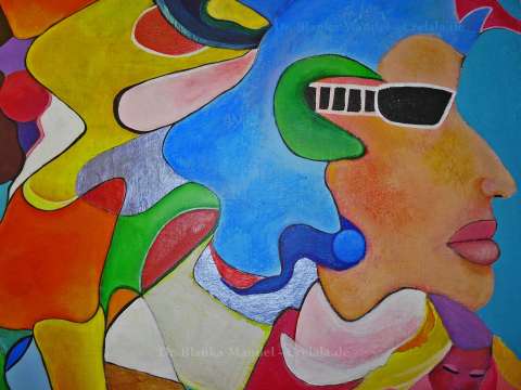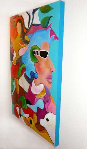 Das Kunstwerk "Incognito" wurde in Acryl auf Leinwand gemalt. Die Seitenränder der Leinwand wurden rechts und links türkis, und oben und unten in einem dunklen rot bemalt. Das Außenmaß dieses Unikates beträgt 90 cm x 60 cm x 4 cm.
