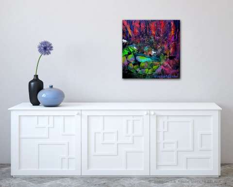 Das Kunstwerk "Mystical Place" wurde in Acryl auf Leinwand gemalt. Das Außenmaß dieses Unikates beträgt 50 cm x 50 cm x 3 cm.