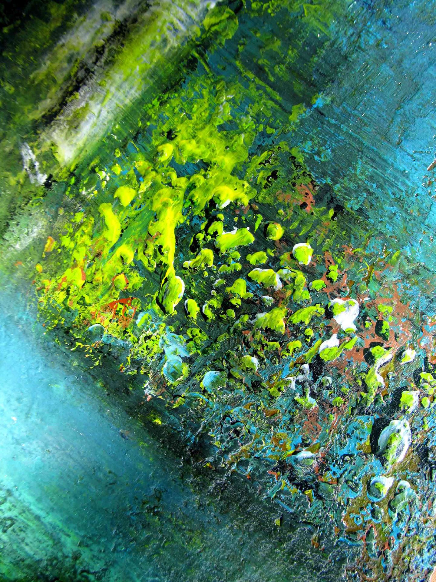 Das Kunstwerk "Mystische Landschaft" wurde in Acryl gespachtelt auf Malkarton gemalt. Das Außenmaß dieses Unikates beträgt 36 cm x 48 cm.