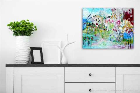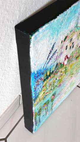 Das Kunstwerk "Sweet Home" wurde in Acryl mit Strukturpaste auf Leinwand gemalt. Das Außenmaß dieses Unikates beträgt 40 cm x 50 cm x 4 cm.