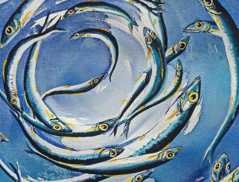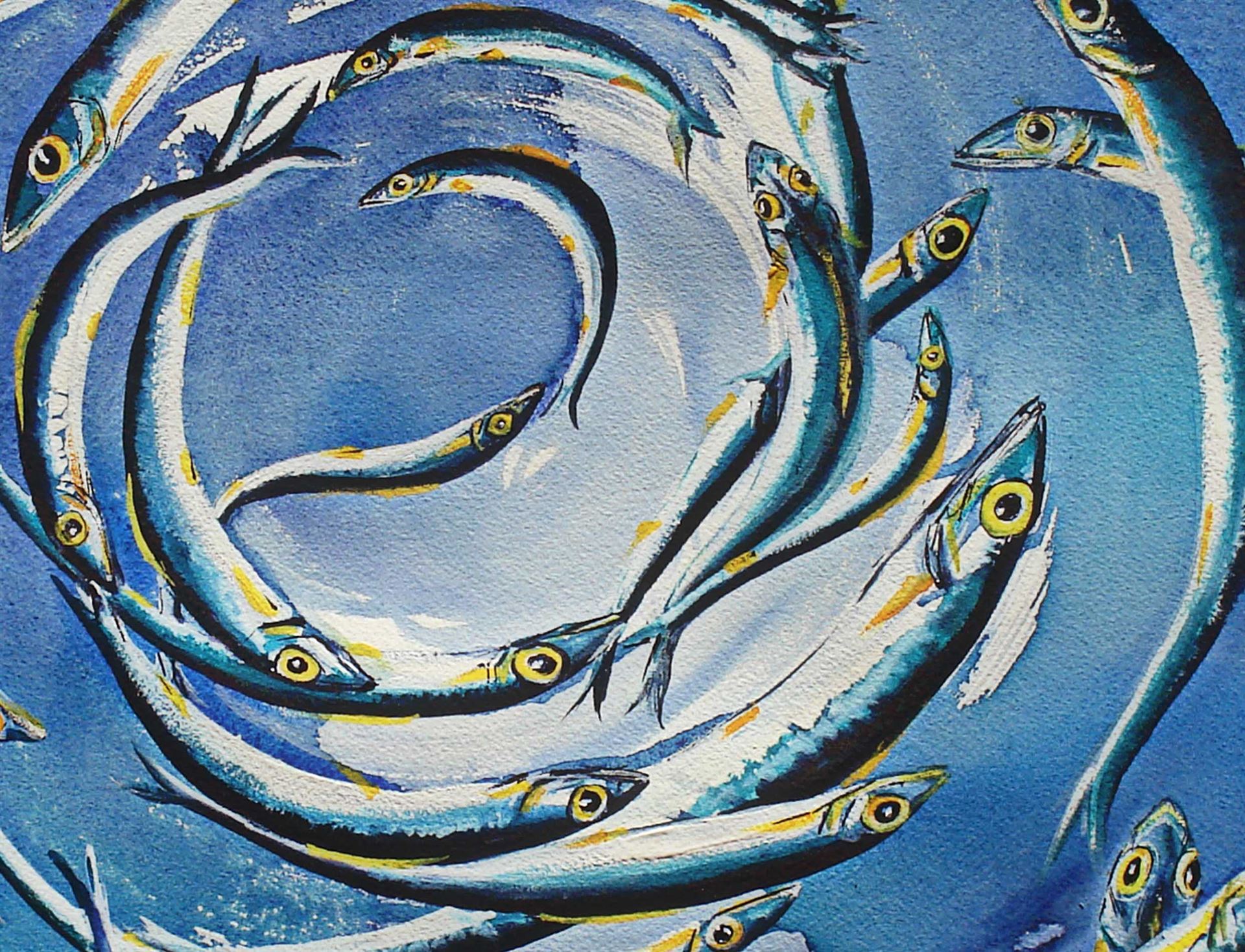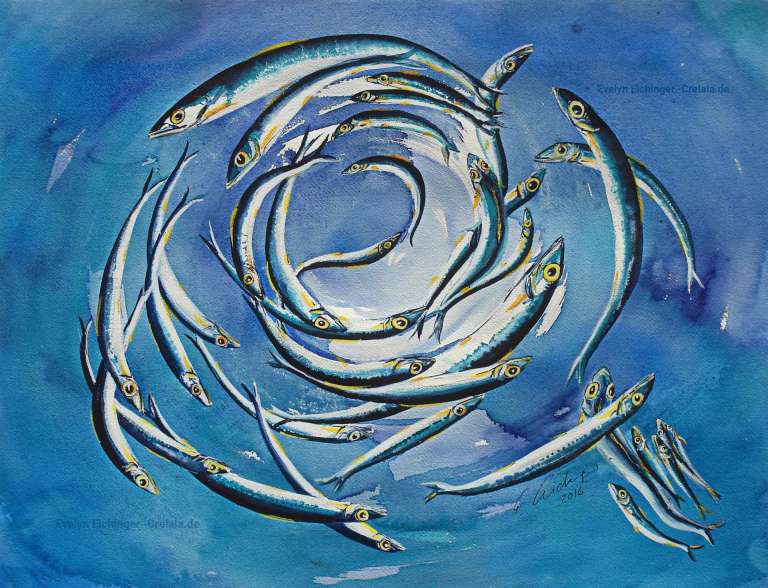 Das Kunstwerk "Fischschwarm" wurde in Aquarell auf Aquarellpapier gemalt. Das Außenmaß dieses Unikates beträgt 46 cm x 60 cm.