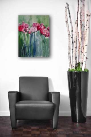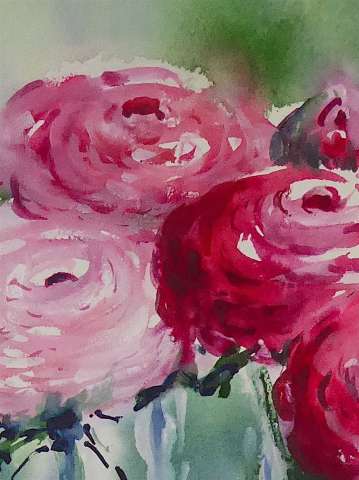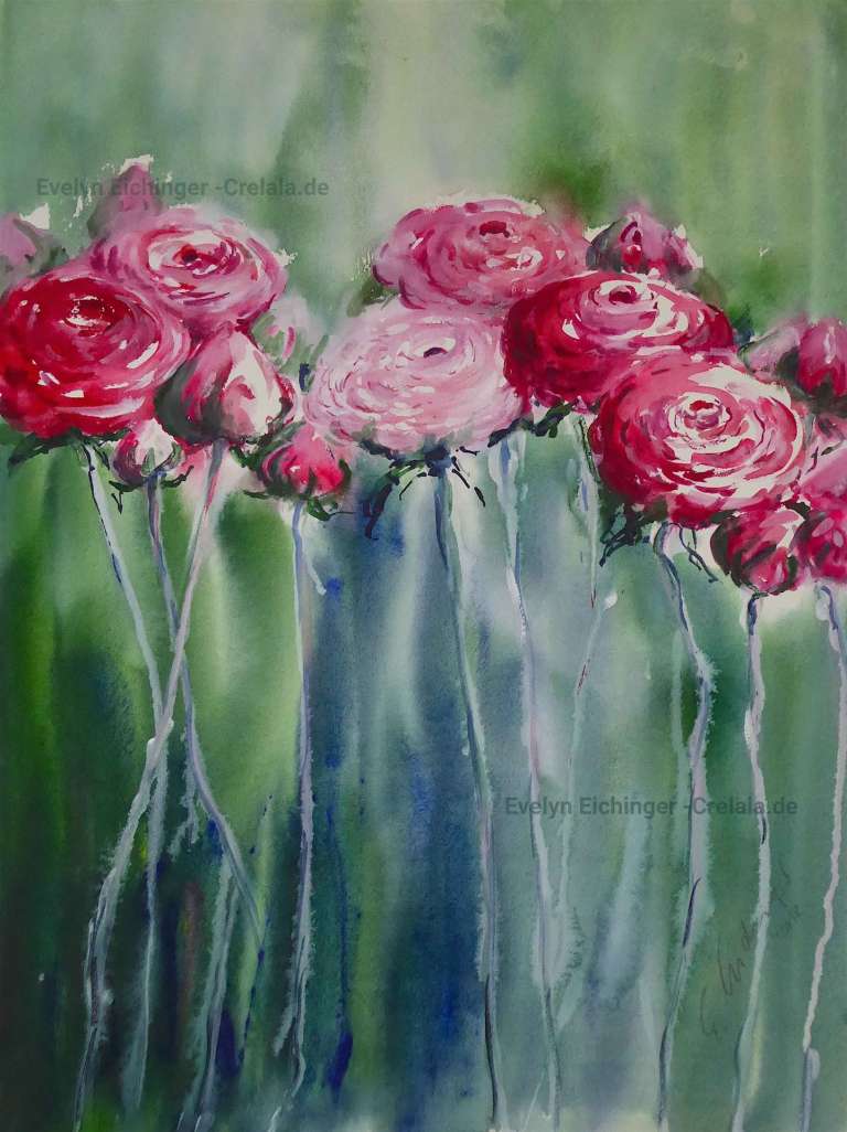 Das Kunstwerk "Ranunkeln" wurde in Aquarell auf Aquarellpapier gemalt. Das Außenmaß dieses Unikates beträgt 60 cm x 46 cm.