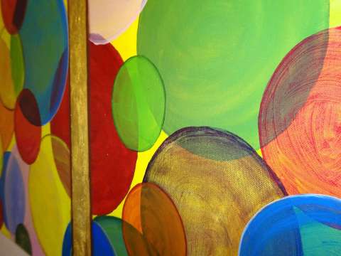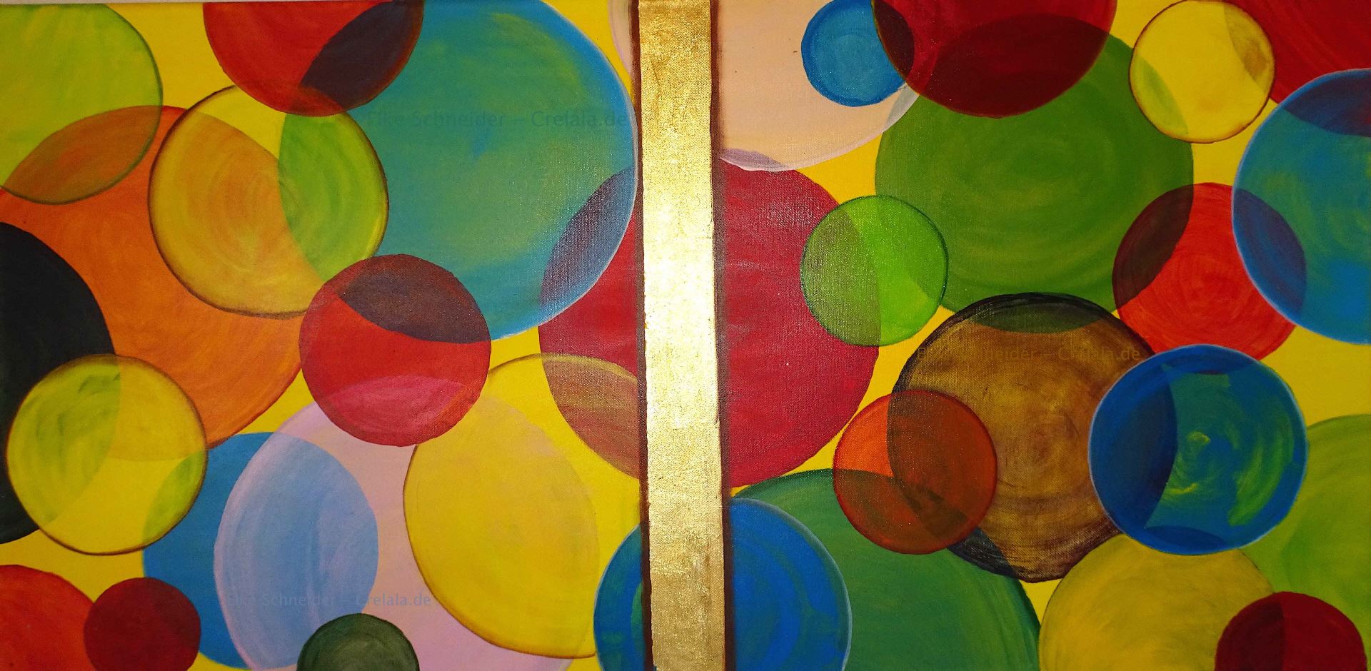 Das Kunstwerk "Bunte Träume" wurde in Acryl mit Blattgold auf Leinwand gemalt. Das Außenmaß dieses Unikates beträgt 50 cm x 100 cm x 1,6 cm.