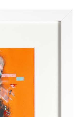Das Kunstwerk "No Surrender-ORANGE" wurde in Acryl auf Papier gemalt. Das Unikat wird gerahmt (Glasrahmen) mit Passepartout zum Verkauf angeboten. Das Außenmaß dieses Unikates beträgt 82 cm x 67 cm x 4 cm.