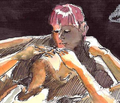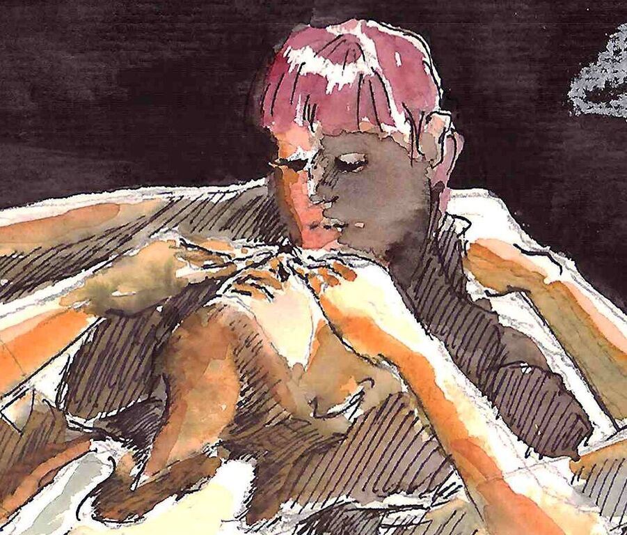 Das Kunstwerk "Handauflegerin" wurde in Aquarell auf Karton gemalt. Das Außenmaß dieses Unikates beträgt 36 cm x 48 cm.