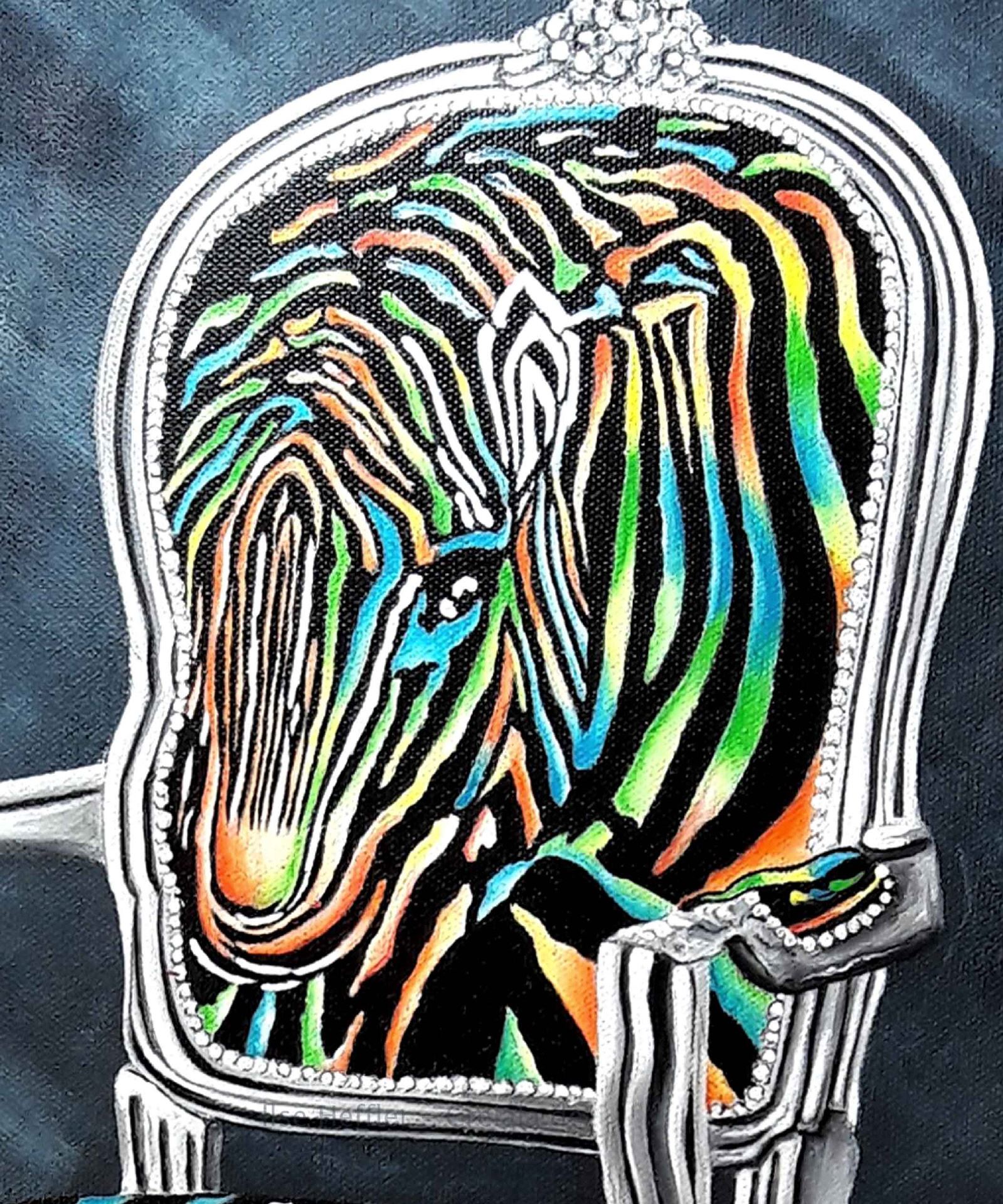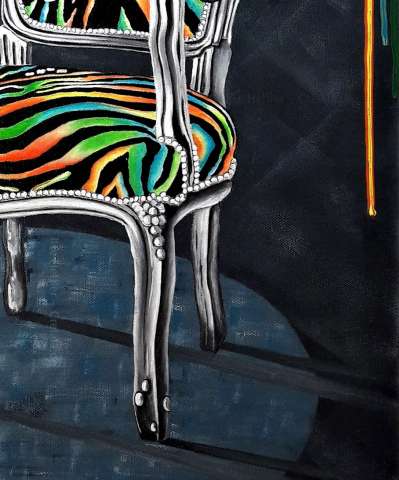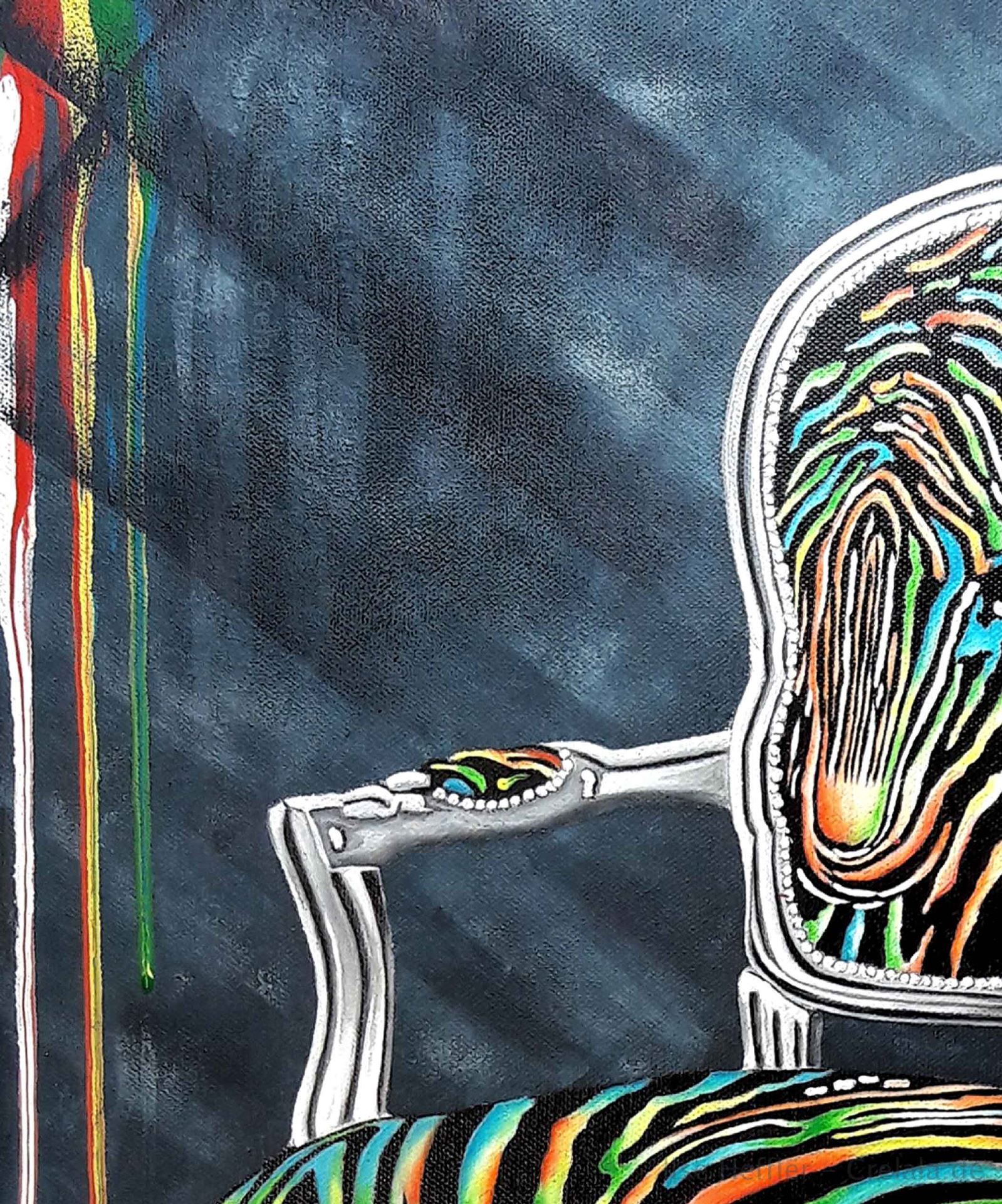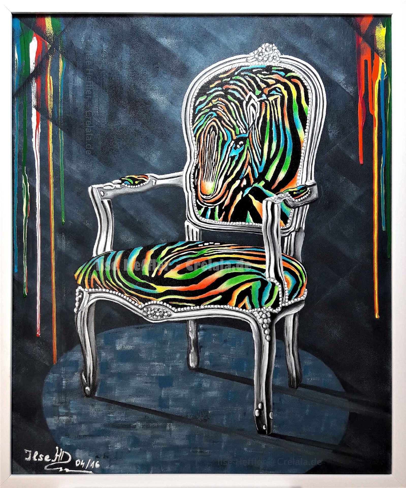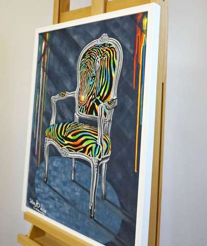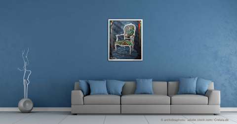 Das Kunstwerk "Regenbogenstuhl" wurde in Acryl auf Leinwand gemalt. Das Unikat wird gerahmt zum Verkauf angeboten. Das Außenmaß dieses Unikates beträgt 62,5 cm x 52,5 cm x 2,5 cm.