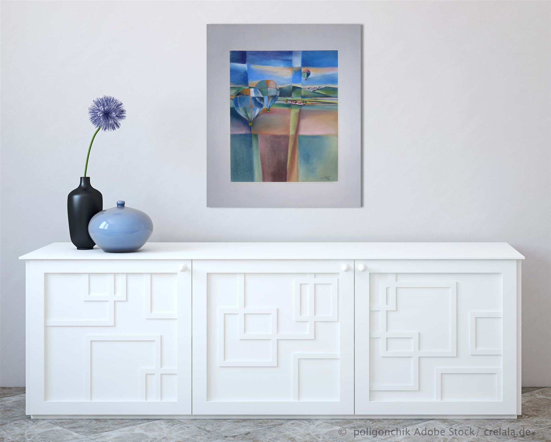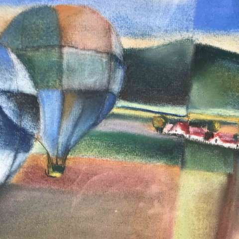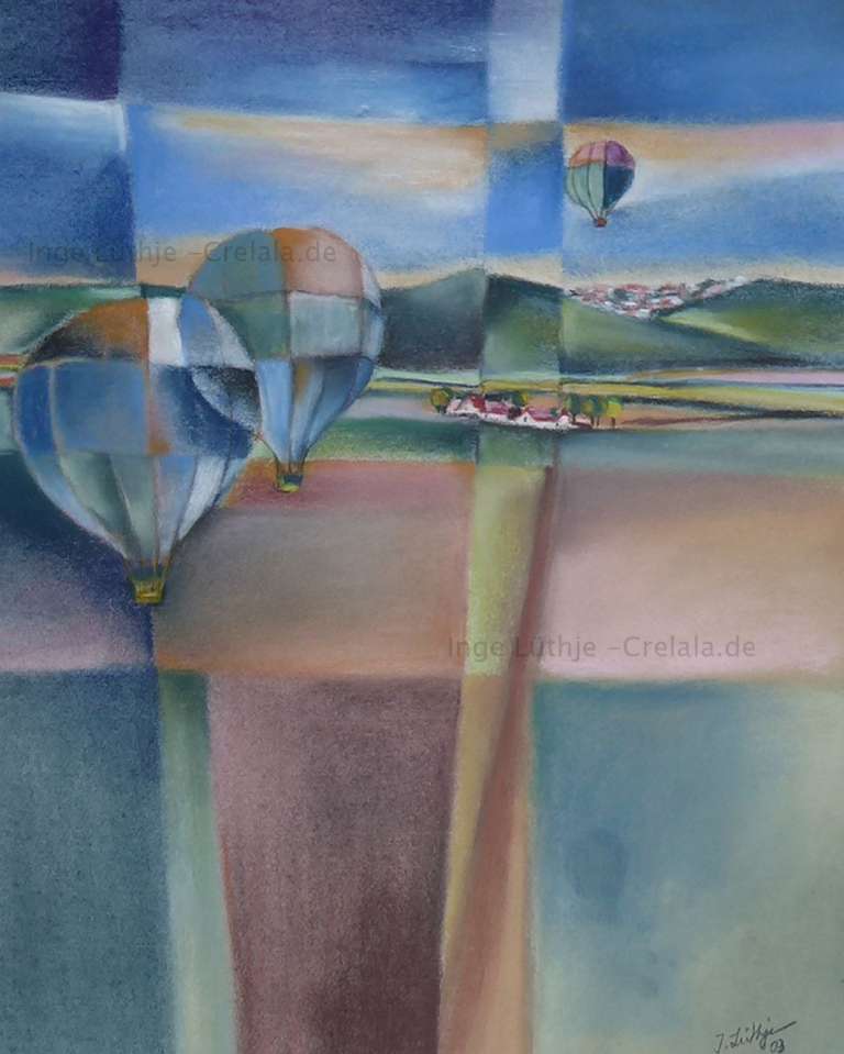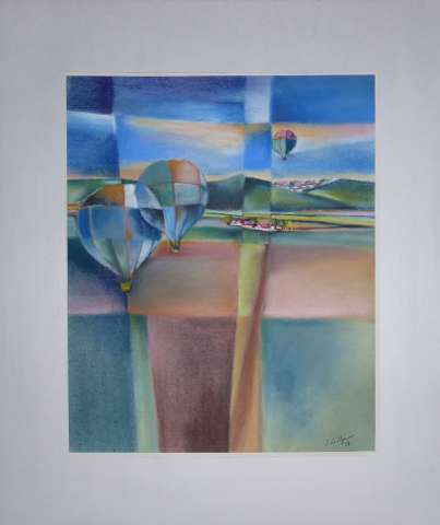 Das Kunstwerk "Ballonfahrt" wurde in Pastellkreide auf Ingrespapier gemalt. Das Unikat wird mit Passepartout aber ohne Rahmen zum Verkauf angeboten. Das Außenmaß dieses Unikates beträgt 50 cm x 40 cm ohne Passepartout. Mit Passepartout beträgt das Außenmaß 80 cm x 60 cm.