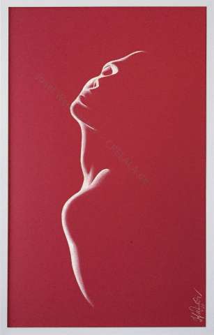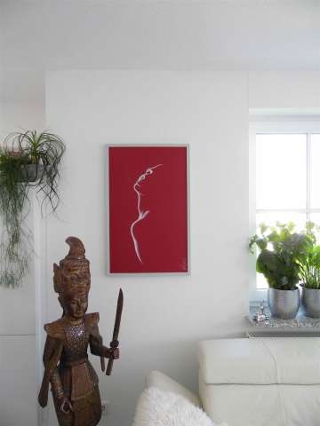 Das Kunstwerk "DÈVOTION - seduction pure" wurde in Ölkreide auf Karton gemalt. Das Unikat wird gerahmt (grau lackierter Holzrahmen) zum Verkauf angeboten. Das Außenmaß dieses Unikates beträgt 83 cm x 52,5 x 3 cm.