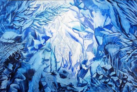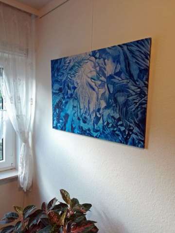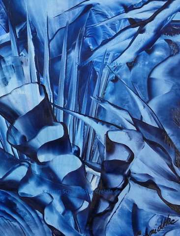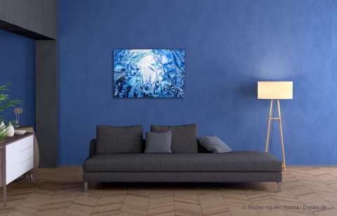 Das Kunstwerk "Fantasie in Blau" wurde mit Enkaustik auf Leinwand gemalt. Das Außenmaß dieses Unikates beträgt 60 cm x 90 cm x 1,8 cm.