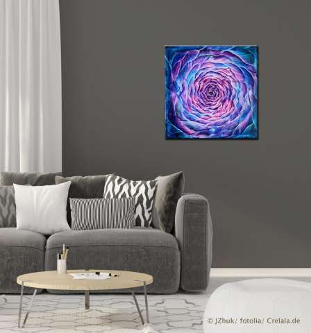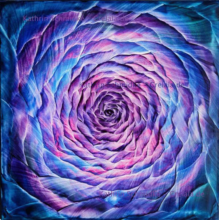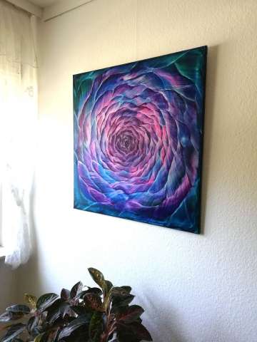 Das Kunstwerk "Magische Rose" wurde mit Enkaustik auf Leinwand gemalt. Das Außenmaß dieses Unikates beträgt 80 cm x 80 cm x 1,8 cm.