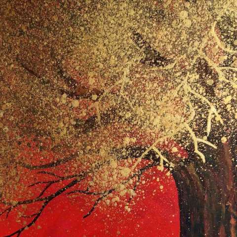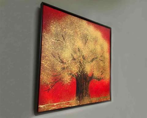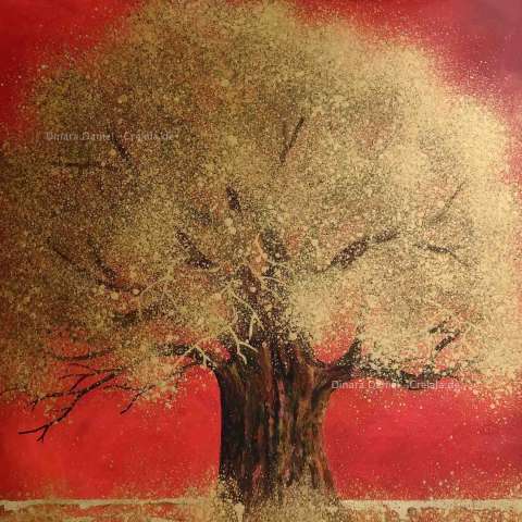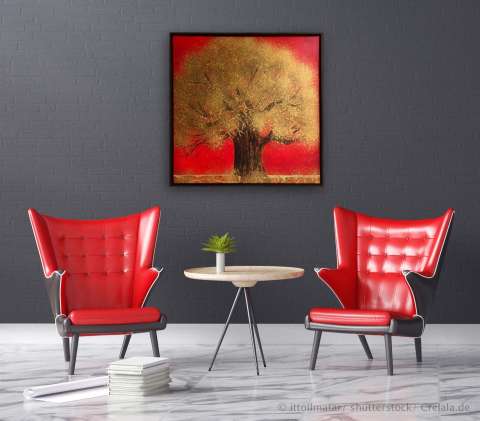 Das Kunstwerk "Goldener Herbst lV" wurde in Acryl und Mixed Media auf Leinwand gemalt. Das Unikat wird mit Rahmen (Schattenfugenrahmen) zum Verkauf angeboten. Das Außenmaß dieses Unikates beträgt 90 cm x 90 cm x 4 cm mit Rahmen 94 cm x 94 cm x 5 cm. .