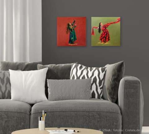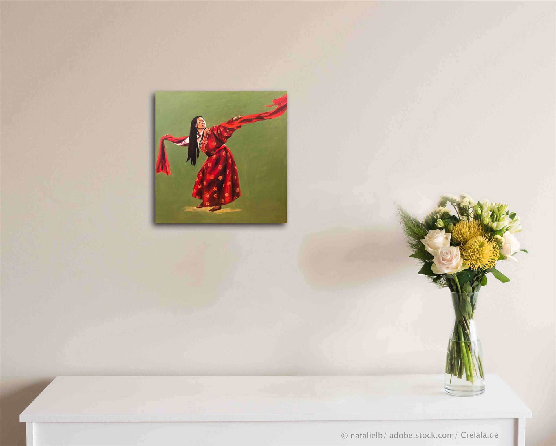 Die Gemälde "Tibetischer Kampf l und Khakassischer Tanz" lassen sich wunderbar kombinieren und als Ensemble aufhängen, siehe Beispielbild. Das Werk "Khakassischer Tanz" ist in diesem Angebot nicht enthalten.