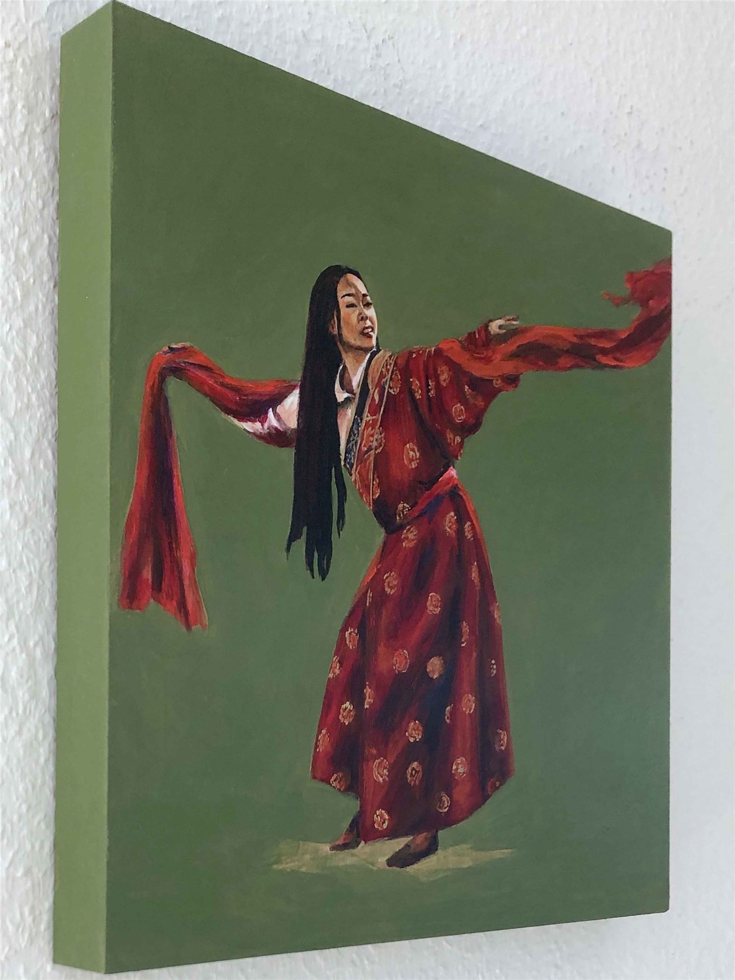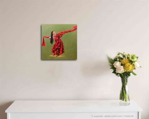 Das Kunstwerk "Tibetischer Tanz l" wurde in Acryl auf Leinwand gemalt. Das Außenmaß dieses Unikates beträgt 30 cm x 30 cm x 3 cm.