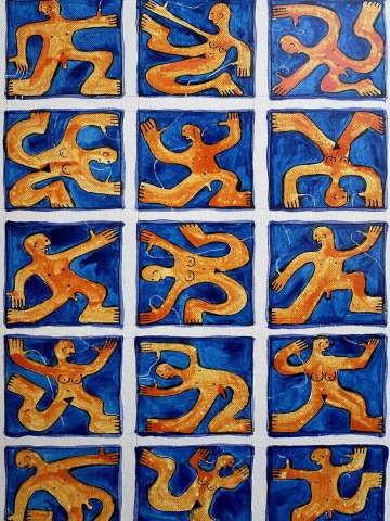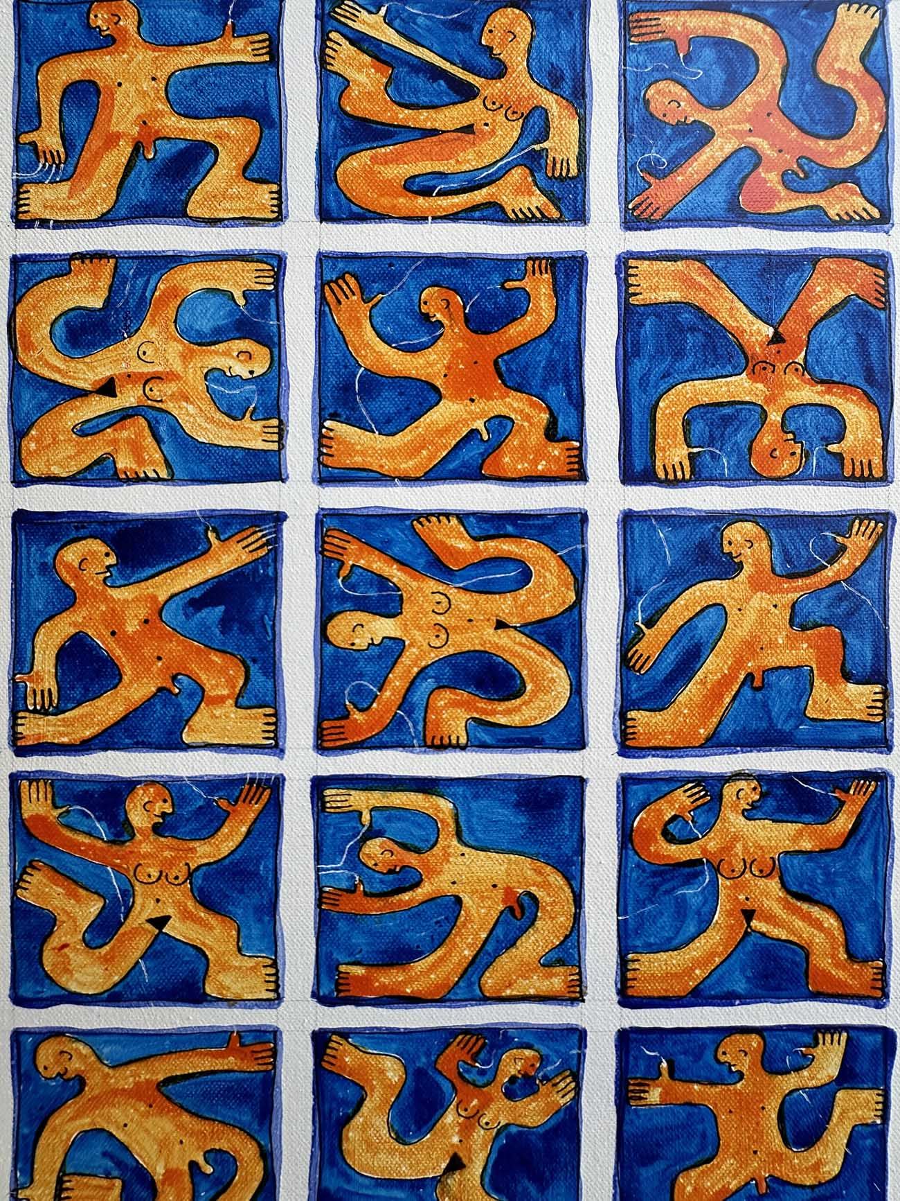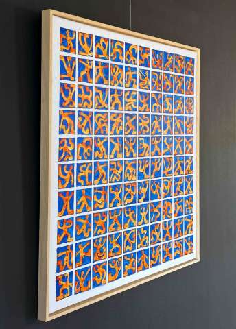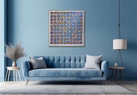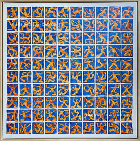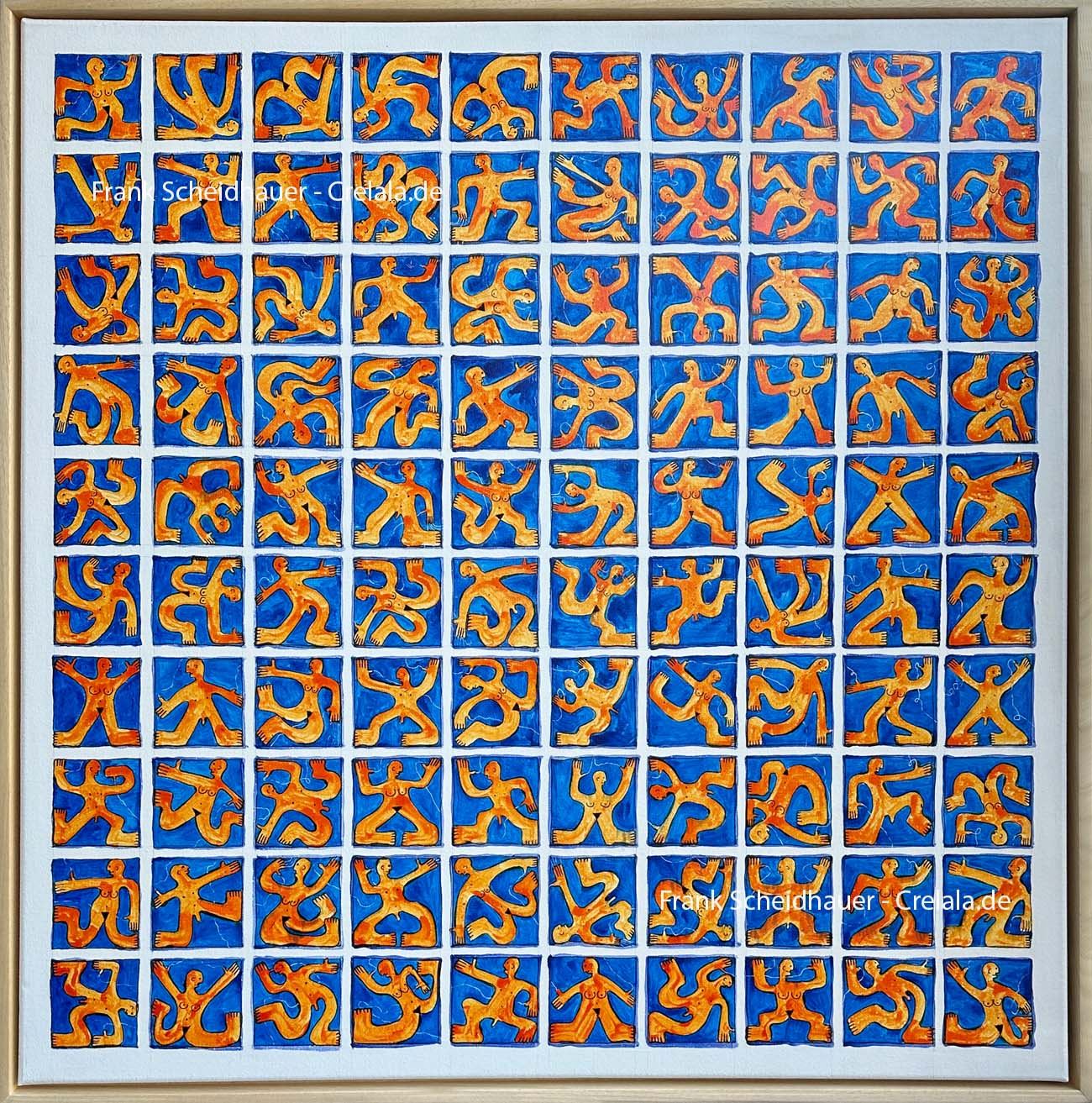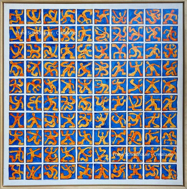 Das Kunstwerk "100 Raumsparmenschen" wurde in Acryl auf Leinwand gemalt. Das Gemälde wird gerahmt angeboten und hat ein Außenmaß von 90 cm x 90 cm x 2 cm.