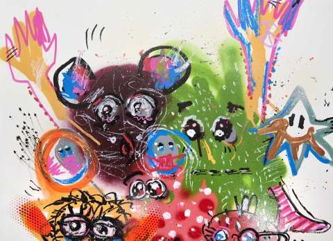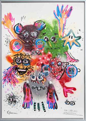 Das Kunstwerk "Bunte Knete l" wurde in Acryl, Spray Paint, Acryl, Ölkreide, Fineliner und Japantusche auf Papier gemalt. Das Gemälde hat ein Außenmaß von 65 cm x 95 cm .
