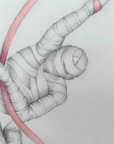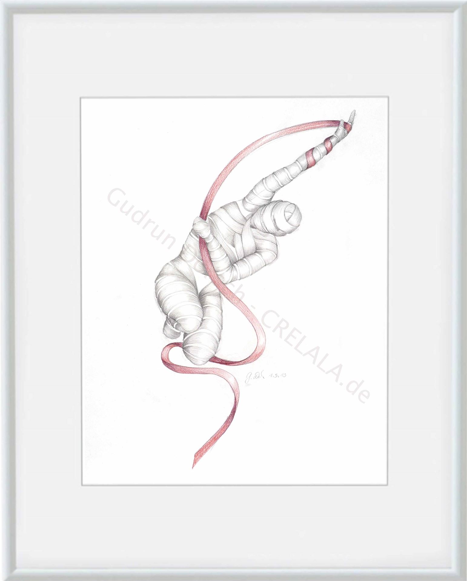 Das Kunstwerk "o.T. 1" wurde in Bleistift und Buntstift auf Papier gemalt. Das Unikat wird mit weißem Passepartout und weißem Kunststoffrahmen zum Verkauf angeboten. Das Außenmaß des Kunstwerkes beträgt 30 cm x 42 cm, mit Rahmen 40 cm x 50 cm x 2 cm.